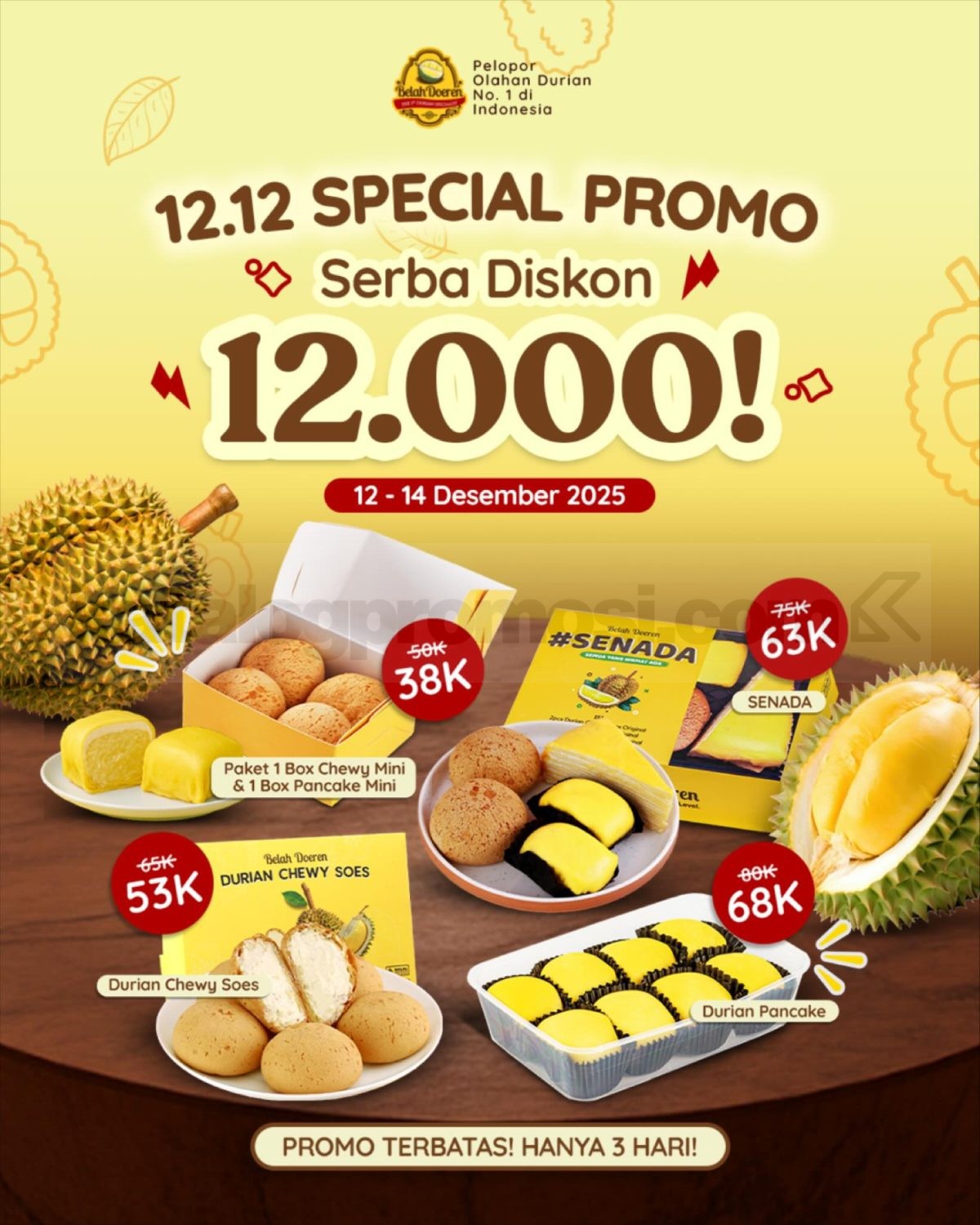 Promo Belah Doeren 12.12 Serba Diskon Rp. 12.000, nikmati paket Chewy, Pancake & Durian hemat + berlaku 12-14 Desember 2025.