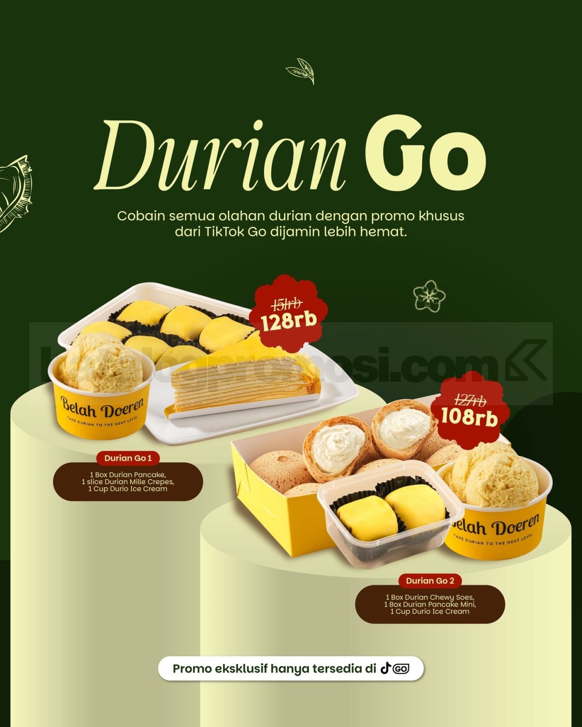 - Durian Go 2: 1 Box Durian Chewy Soes, 1 Box Durian Pancake Mini, dan 1 Cup Durio Ice Cream seharga Rp. 108.000