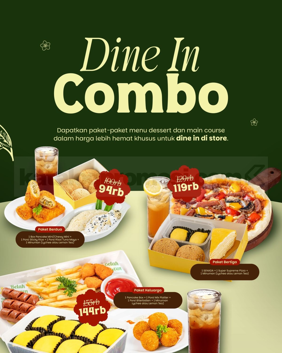 Paket menu dessert dan main course dengan harga lebih hemat untuk makan di tempat.