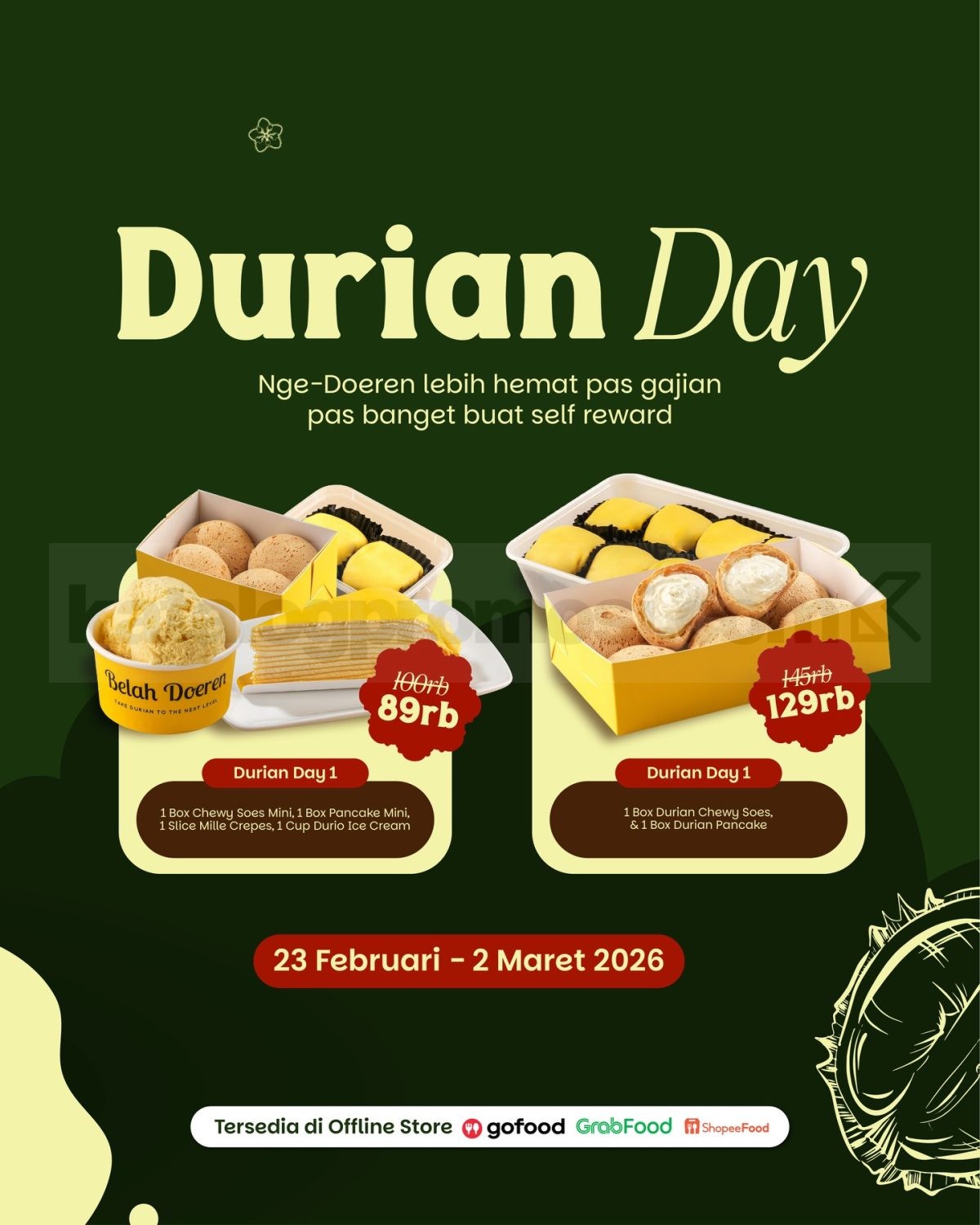Promo Durian Day hanya berlaku pada tanggal 23 Februari – 2 Maret 2026.