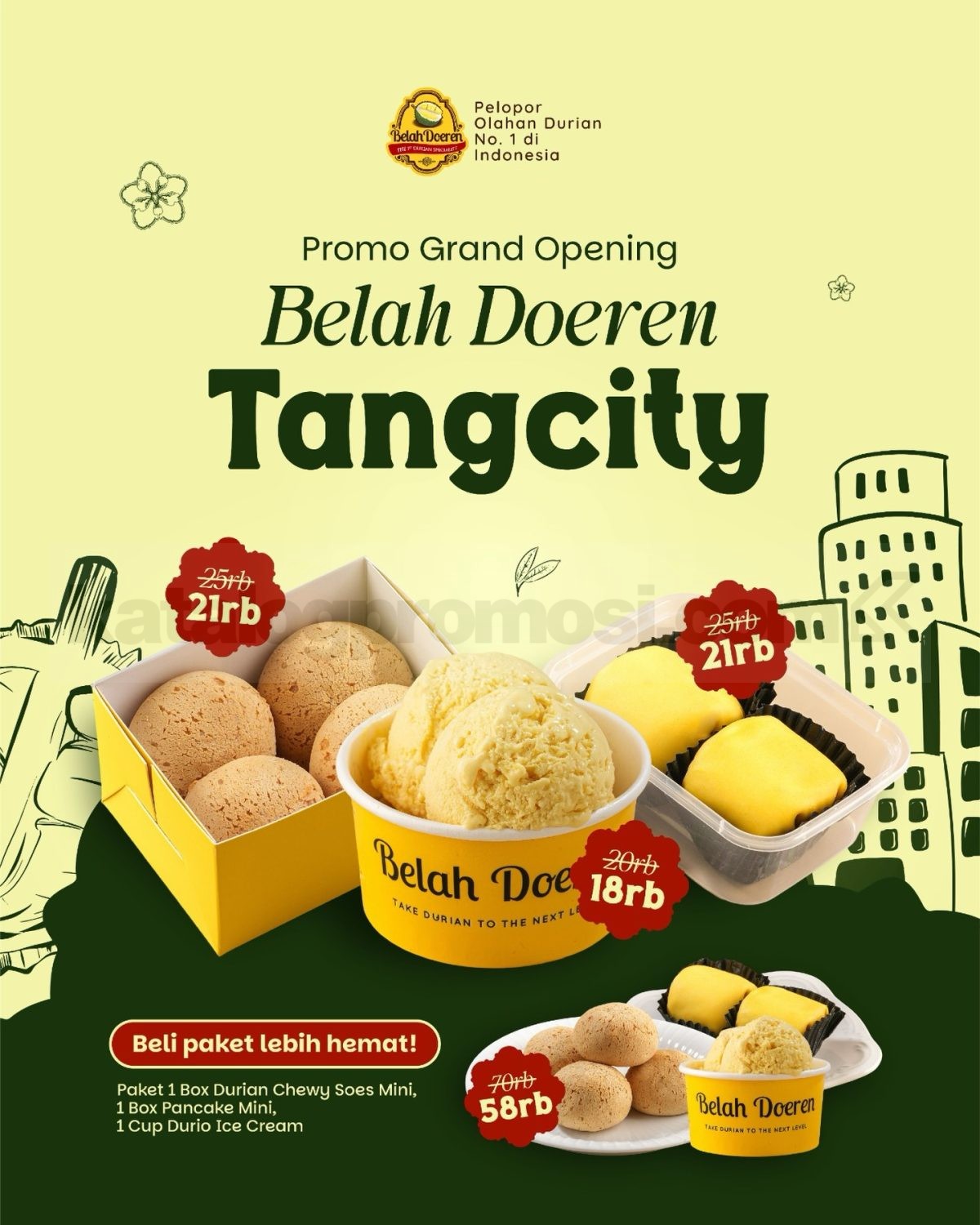 Paket Hemat Rp. 58.000 terdiri dari 1 Box Durian Chewy Soes Mini, 1 Box Pancake Mini, dan 1 Cup Durio Ice Cream.