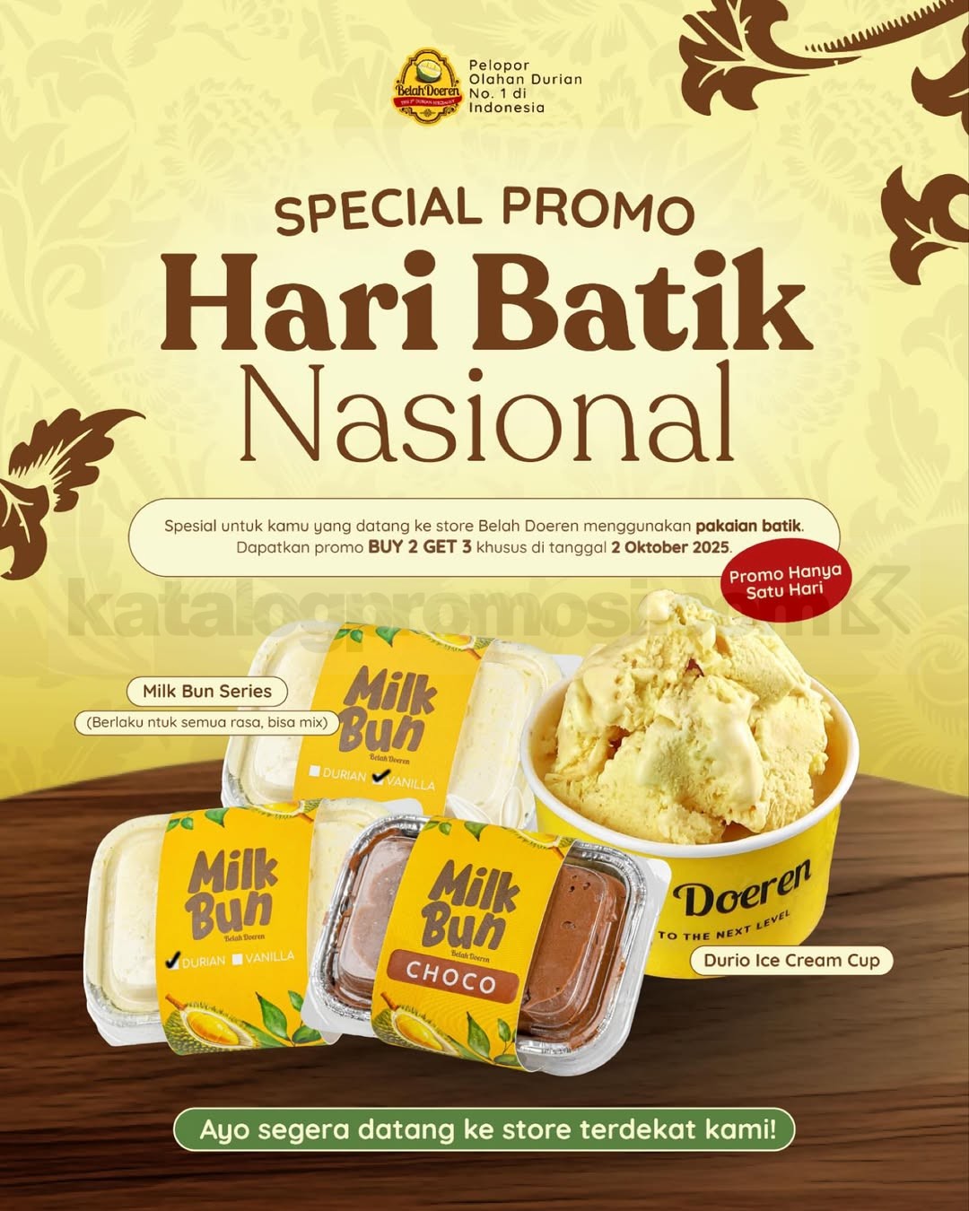 Promo Belah Doeren Hari Batik Nasional cuma berlaku 2 Oktober 2025! Pakai baju batik dan dapetin Buy 2 Get 3 Milk Bun & Durio Ice Cream.