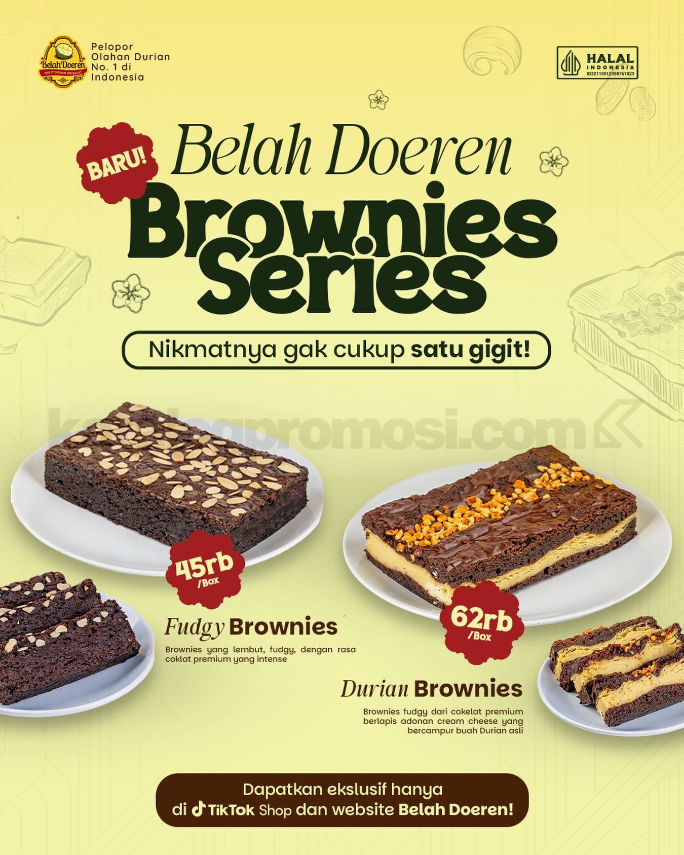 Promo Belah Doeren NEW! Brownies Series mulai Rp. 45.000 dengan dua varian brownies premium, pembelian via TikTok Shop & website berlaku selama periode promo.
