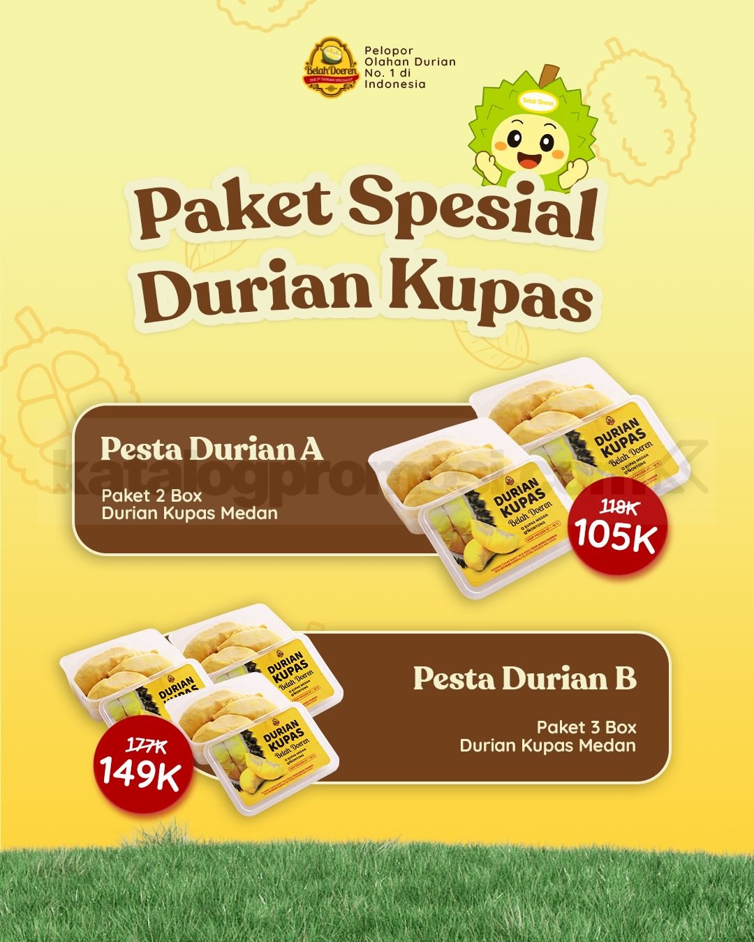 Promo Belah Doeren Pesta Durian Online mulai Rp. 105.000, nikmati paket durian kupas & pancake berlaku selama persediaan masih ada.