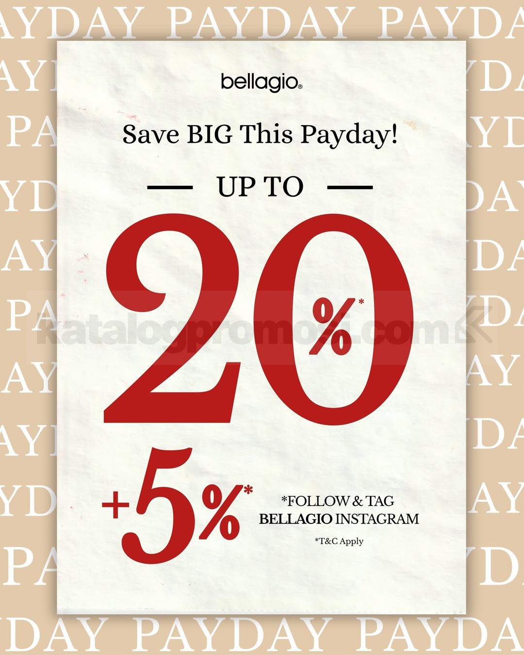 Promo Bellagio Payday Sale Diskon 25% potongan hingga 20% + ekstra 5% dengan follow dan tag Instagram berlaku selama periode promo di seluruh outlet