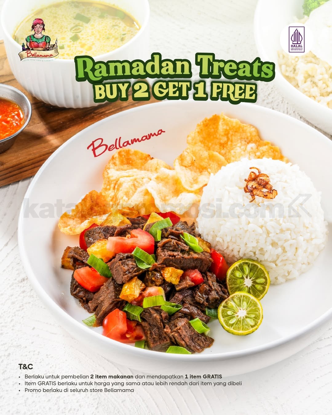 Promo Bellamama Ramadan Treats Buy 2 Get 1 Free beli 2 makanan gratis 1 item setara atau lebih rendah, berlaku selama periode promo di seluruh store Bellamama.