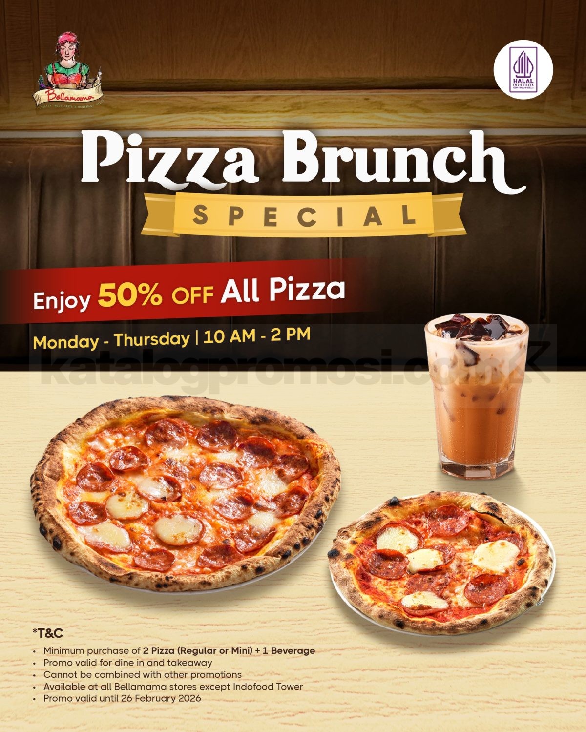 Promo Bellamama Special Pizza Brunch Discount 50% Off All Pizza diskon setengah harga untuk semua pizza, minimum 2 pizza + minuman, berlaku mulai tanggal 20 Januari 2026 – 26 Januari 2026