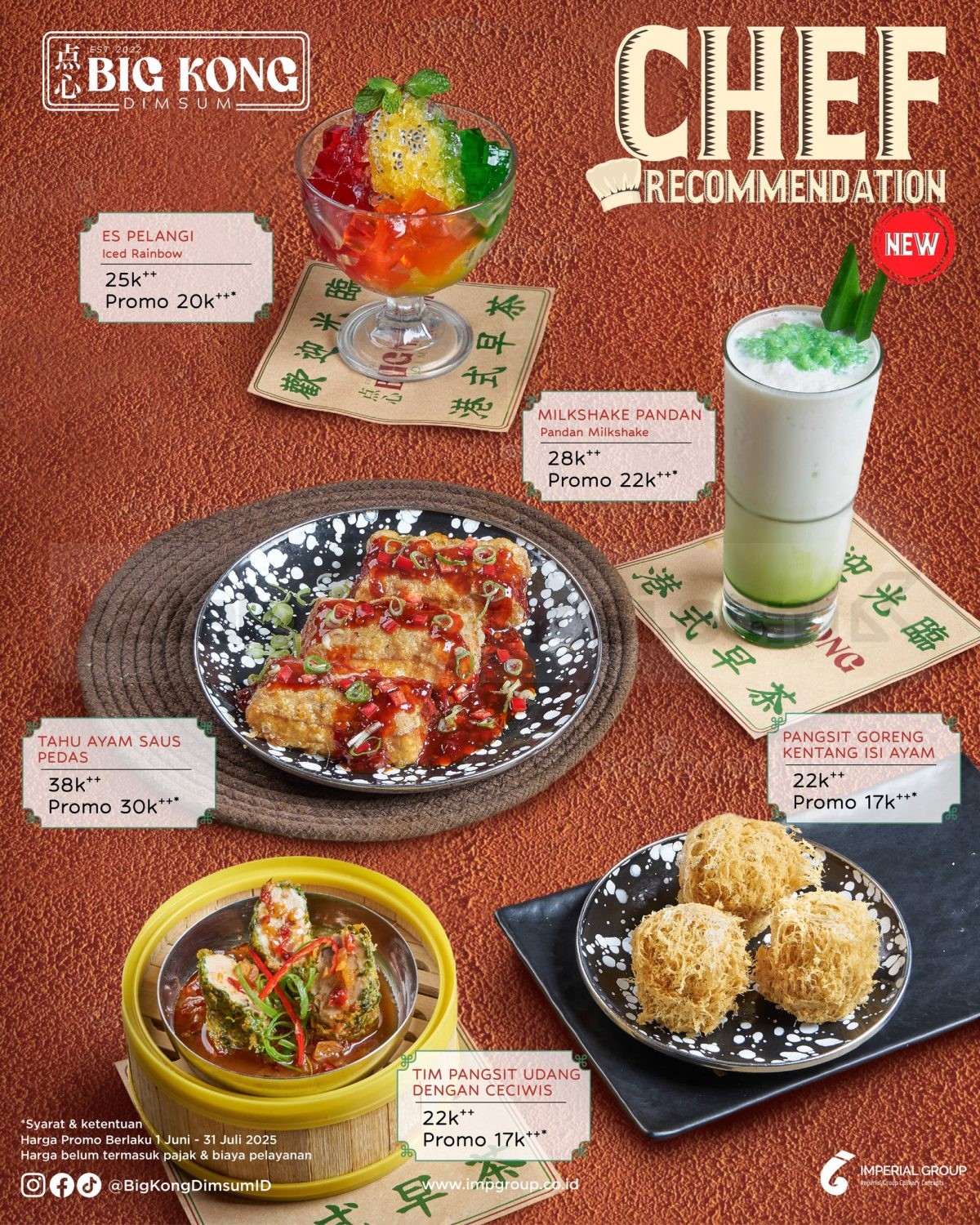 Promo Big Kong Dimsum NEW! Chef Recommendation mulai Rp.20.000 dengan pilihan menu diskon dan harga spesial, berlaku mulai tanggal 1 Desember 2025 – 31 Januari 2026 di seluruh outlet.
