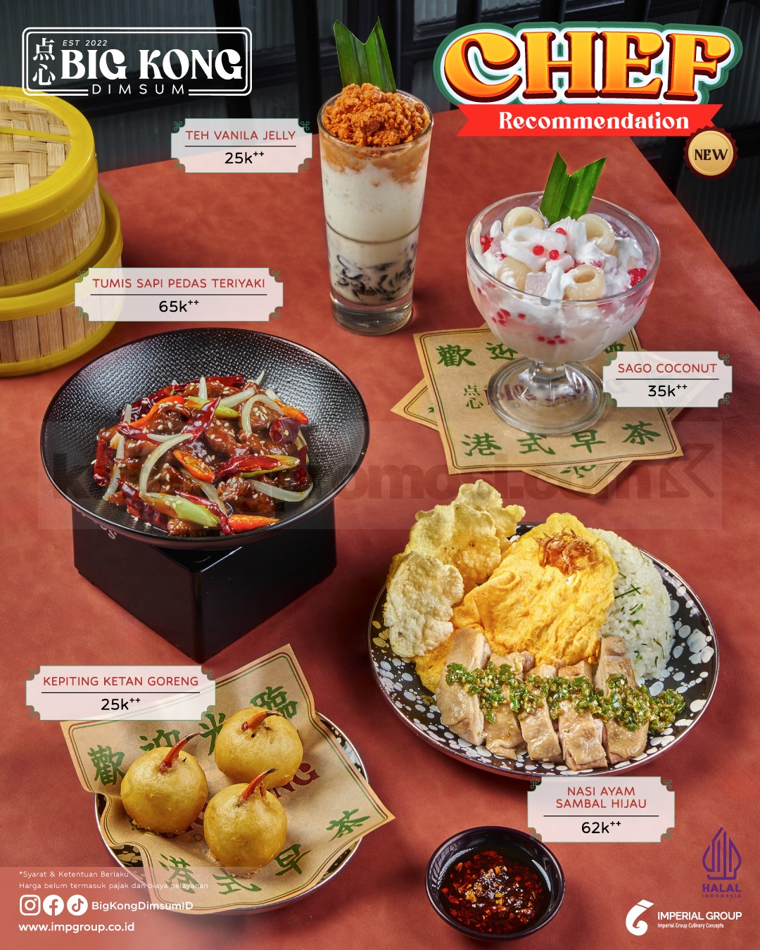 Seluruh harga pada promo Chef Recommendation Big Kong Dimsum ini belum termasuk pajak dan biaya layanan yang berlaku di outlet.