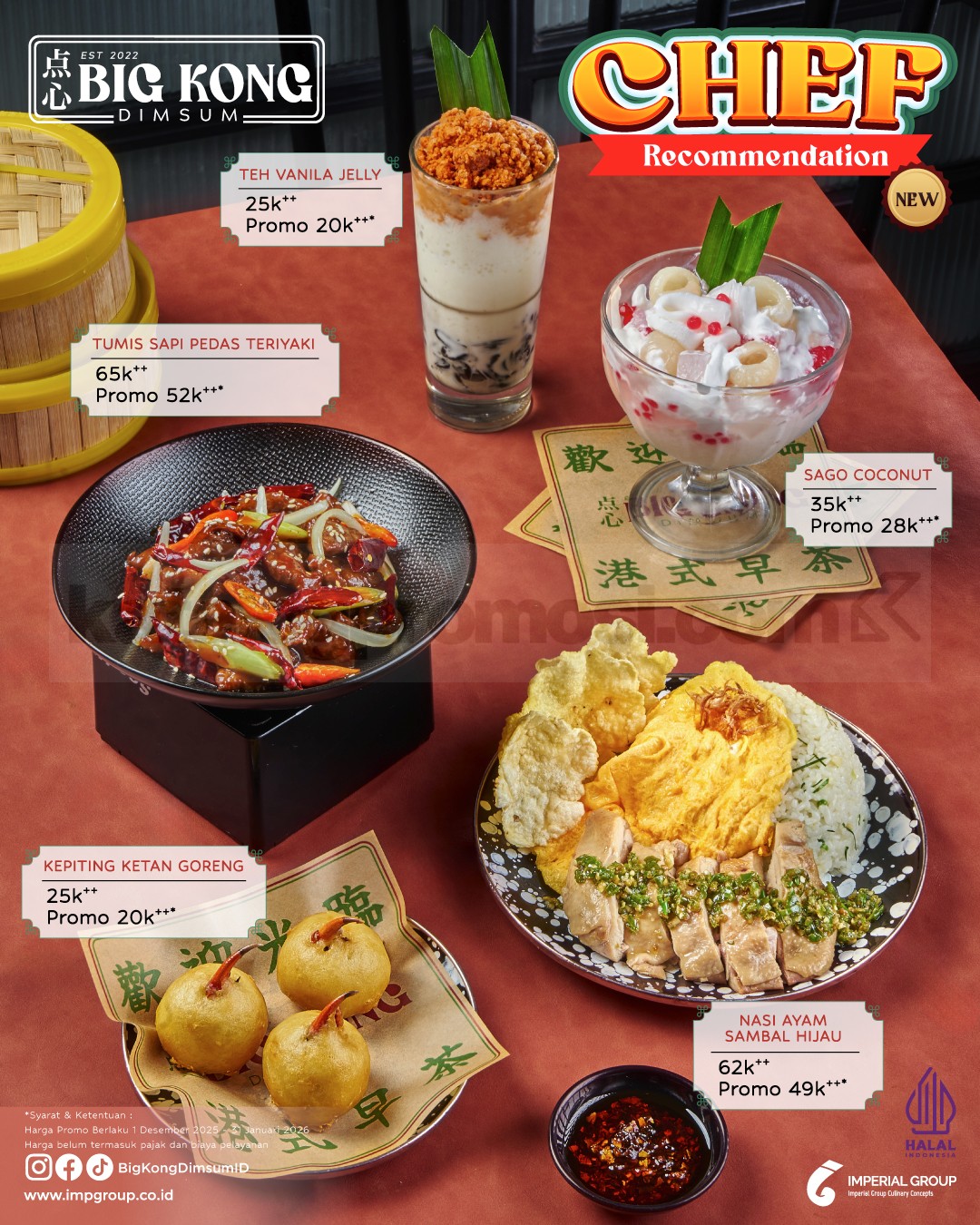 Promo Big Kong Dimsum NEW! Chef Recommendation mulai Rp.20.000 dengan pilihan menu diskon dan harga spesial, berlaku mulai tanggal 1 Desember 2025 – 31 Januari 2026 di seluruh outlet.