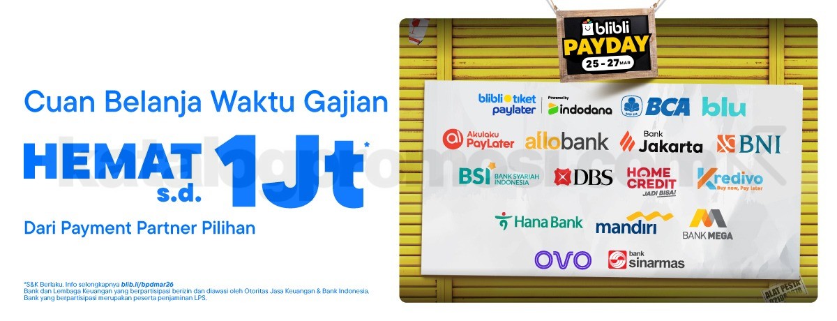 Promo Blibli Payday hemat Rp. 1.500.000 dengan payment partner favorit, berlaku 25-27 Maret 2026, nikmati belanja hemat di Blibli.