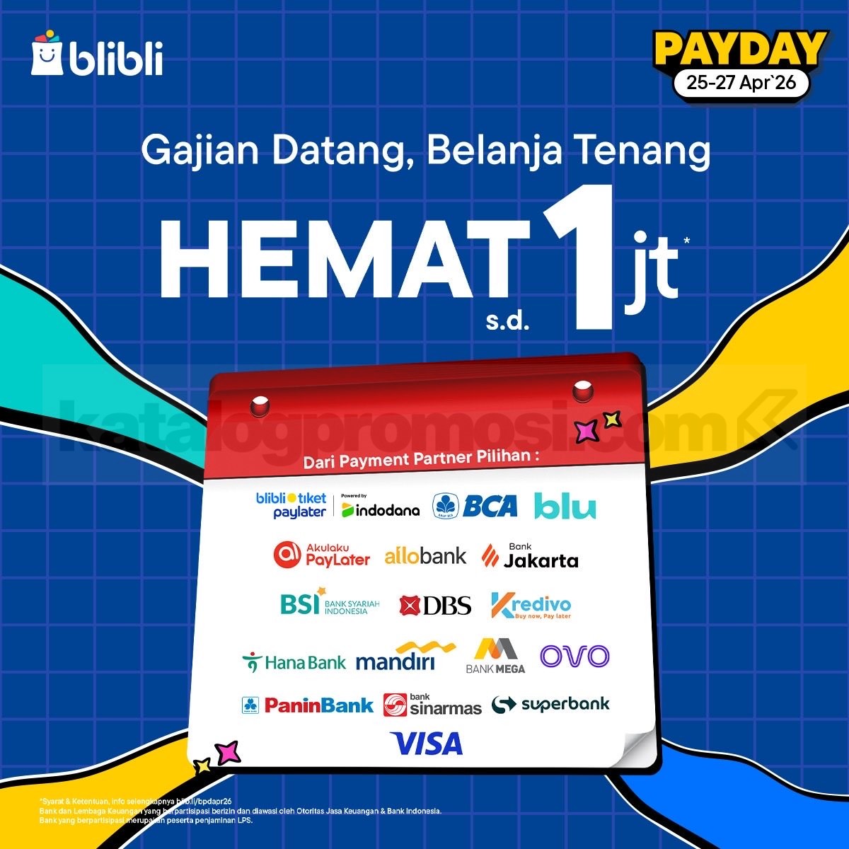 Promo Blibli Payday Payment Partner hemat hingga Rp. 1.000.000 dengan berbagai metode pembayaran, berlaku mulai tanggal 25 April 2026 – 27 April 2026.