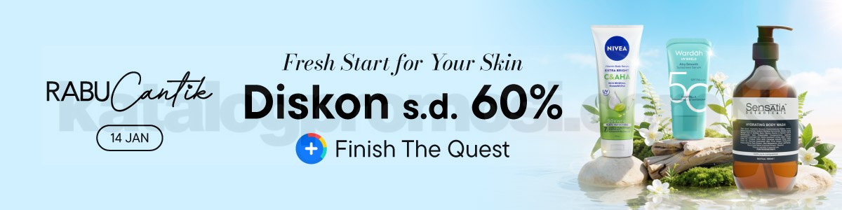 Segera cek katalog dan selesaikan misi belanja Finish The Quest untuk nikmati bonus tambahan. Jangan lewatkan kesempatan untuk kulit lebih glowing dengan promo Rabu Cantik Blibli!