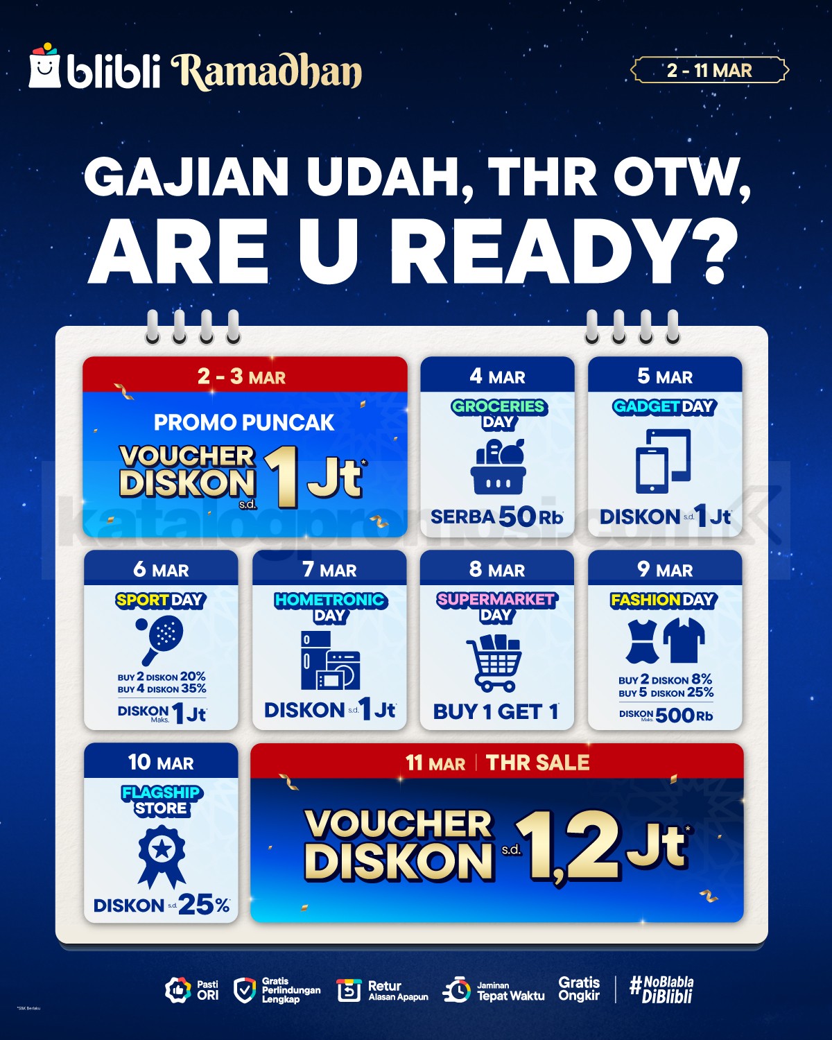 Promo Blibli Ramadhan Diskon hingga Rp. 1 juta dengan Groceries Day 50 ribu dan THR Sale voucher Rp. 1,2 juta berlaku mulai tanggal 2 Maret 2026 – 11 Maret 2026.