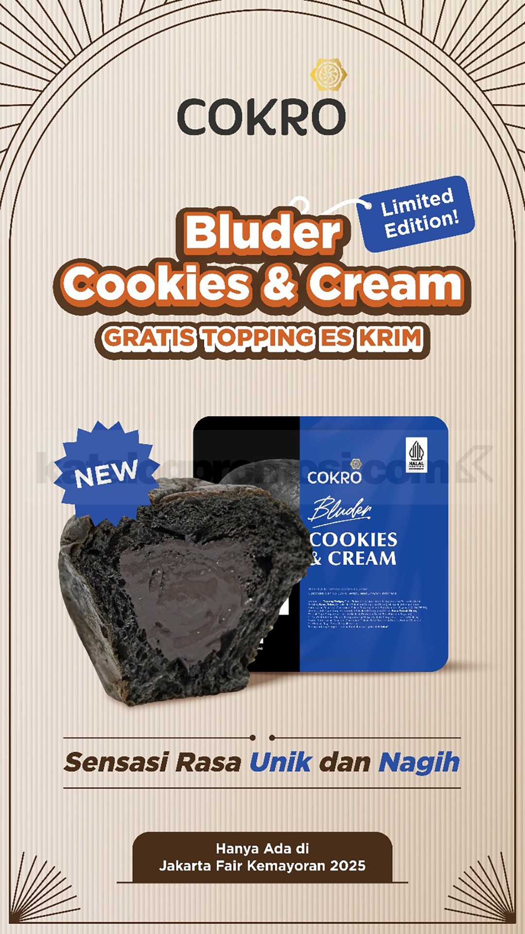 Promo Bluder Cokro Jakarta Fair Kemayoran 2025 siap manjain pecinta roti lembut! Ada Bluder Cookies & Cream eksklusif cuma di PRJ, paket hemat gratis topping es krim, plus kolaborasi seru bareng Krim Kafe.
