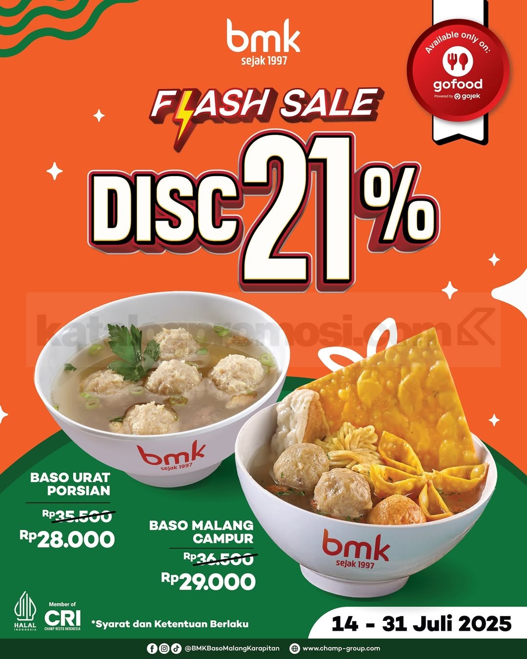 Promo Flash Sale di BMK Β ini cuma berlaku untuk pesanan via GoFood ya, jadi tinggal klik-klik di app, pesananmu langsung otw ke rumah. Cocok banget buat makan siang kilat, dinner santai, atau ngemil sore bareng teman kerja. π«Ά
