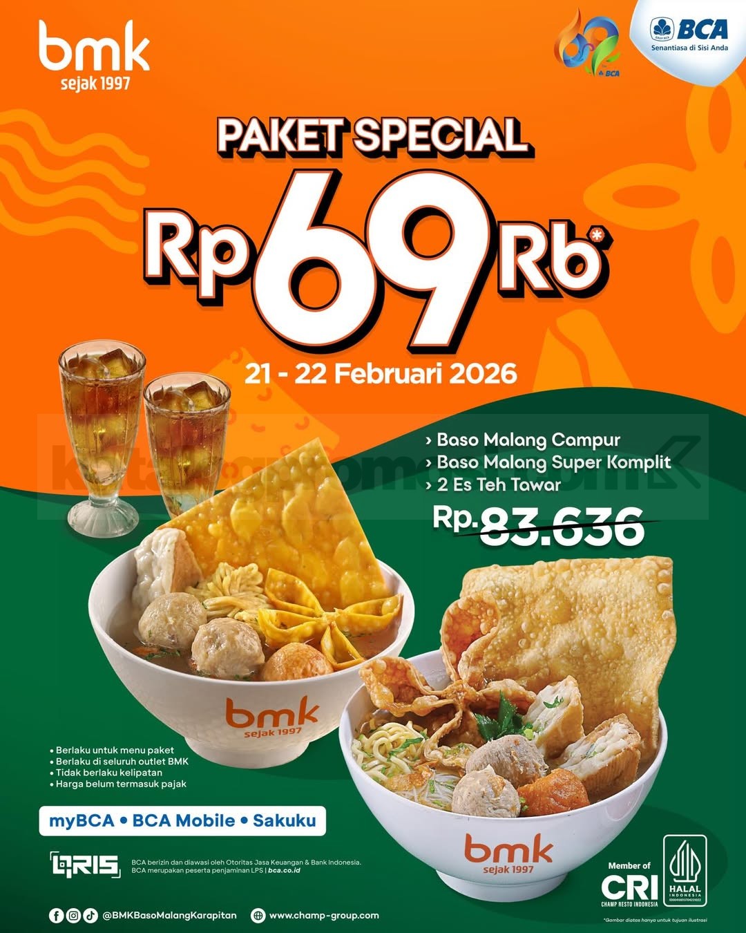 Promo BMK Spesial Ulang Tahun BCA mulai Rp. 69 ribu paket Baso Malang + 2 Es Teh bayar myBCA berlaku mulai tanggal 21 Februari 2026 – 22 Februari 2026 di seluruh outlet