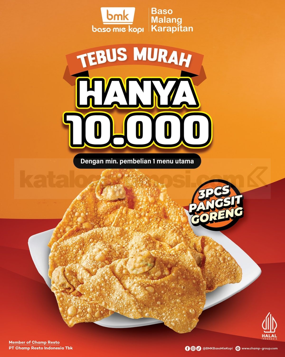 Promo BMK Tebus Murah Pangsit Goreng mulai Rp. 11.000, tebus 3 pcs pangsit goreng dengan beli 1 main course, berlaku 1 Maret – 31 Desember 2025.