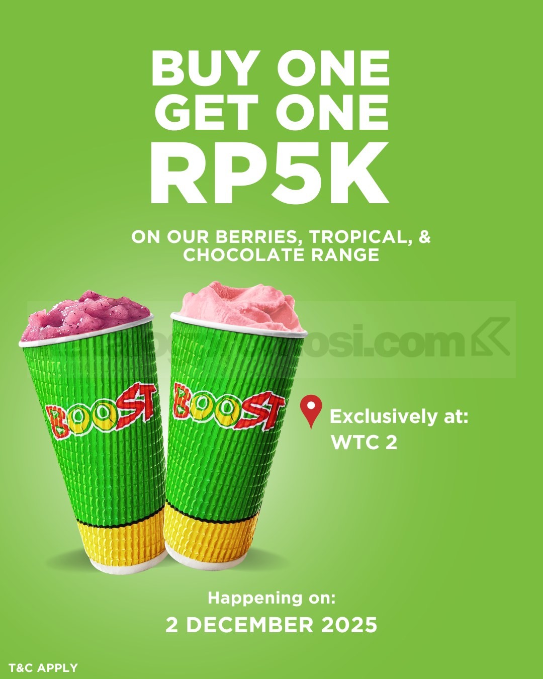 Rasakan sensasi minuman segar Boost dengan harga hemat sambil merayakan grand opening outlet terbaru di WTC 2. Jangan sampai kelewatan, karena promo ini hanya untuk tanggal 2 Desember 2025!
