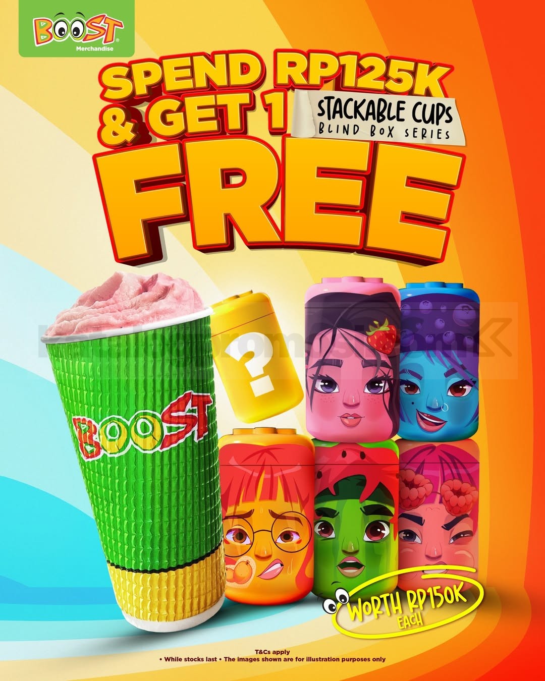 Promo Boost Juice Free Blind Box Stackable Cups ini menawarkan kesempatan mendapatkan merchandise gratis hanya dengan minimum pembelian Rp. 125.000 dalam satu transaksi. Menariknya, ada 6 desain berbeda dengan 1 desain misteri yang bikin pengalaman unboxing jadi makin seru dan nggak bisa ditebak 😝✨