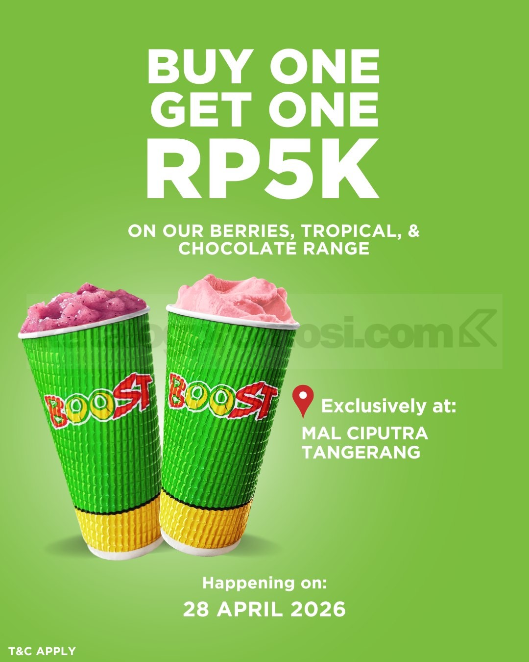 Promo Boost Juice Grand Opening Beli 1 Gratis 1 hanya tambahan Rp. 5.000 nikmati menu pilihan berlaku 28 April 2026 di Mal Ciputra Tangerang