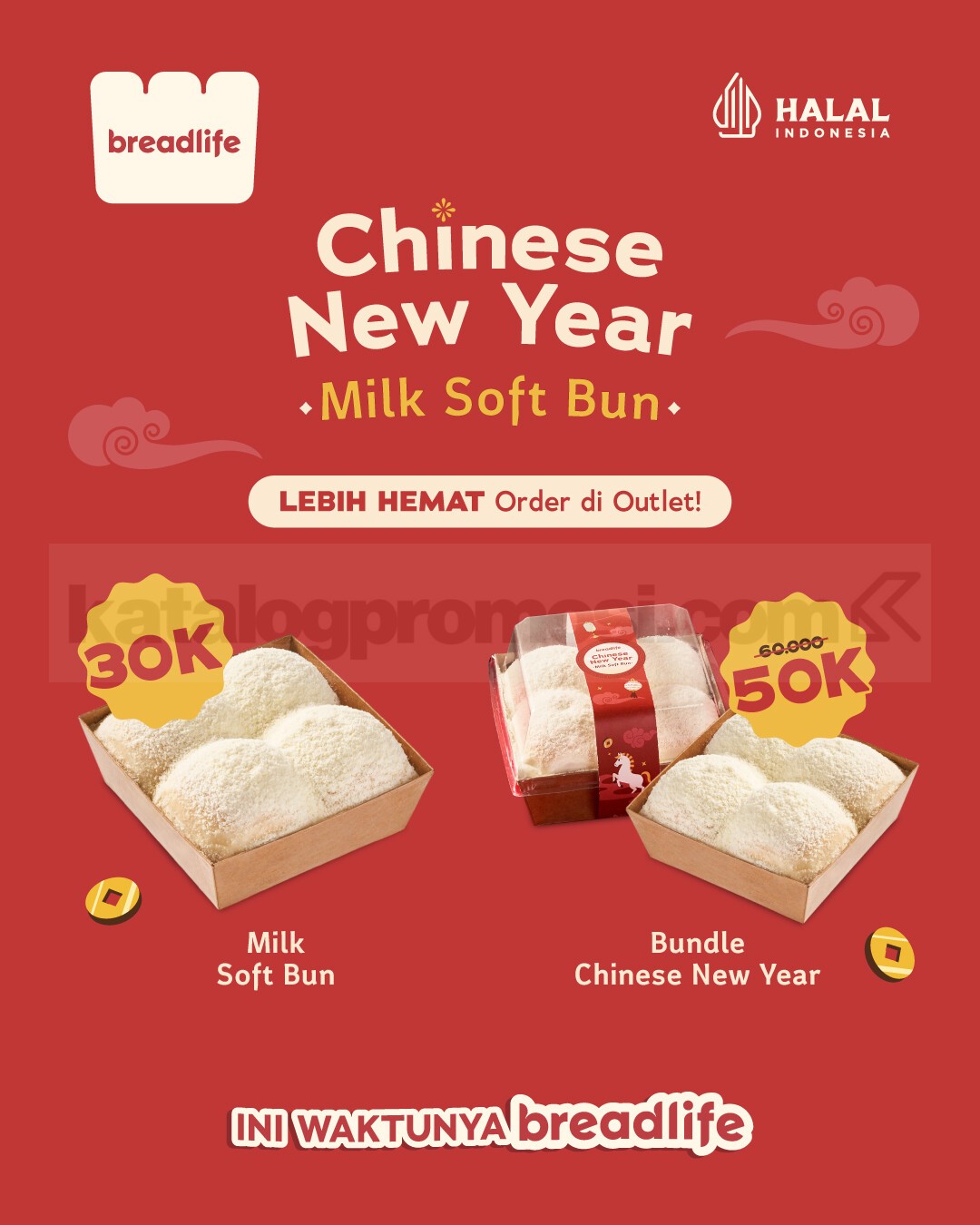 Promo breadlife NEW! Milk Soft Bun Chinese New Year mulai Rp. 30.000 dengan tekstur lembut dan rasa milky, tersedia bundle Rp. 50.000, berlaku periode Imlek.