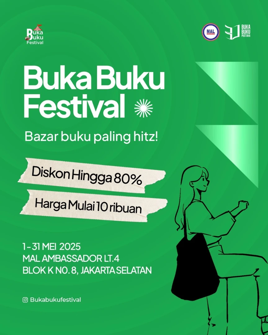 Buat para pencinta buku, jangan sampai kelewatan Buka Buku Festival di Mal Ambassador! Diskon besar-besaran hingga 80% untuk koleksi buku terbaik dari berbagai genre, dan harga mulai dari Rp10.000-an aja 📚✨