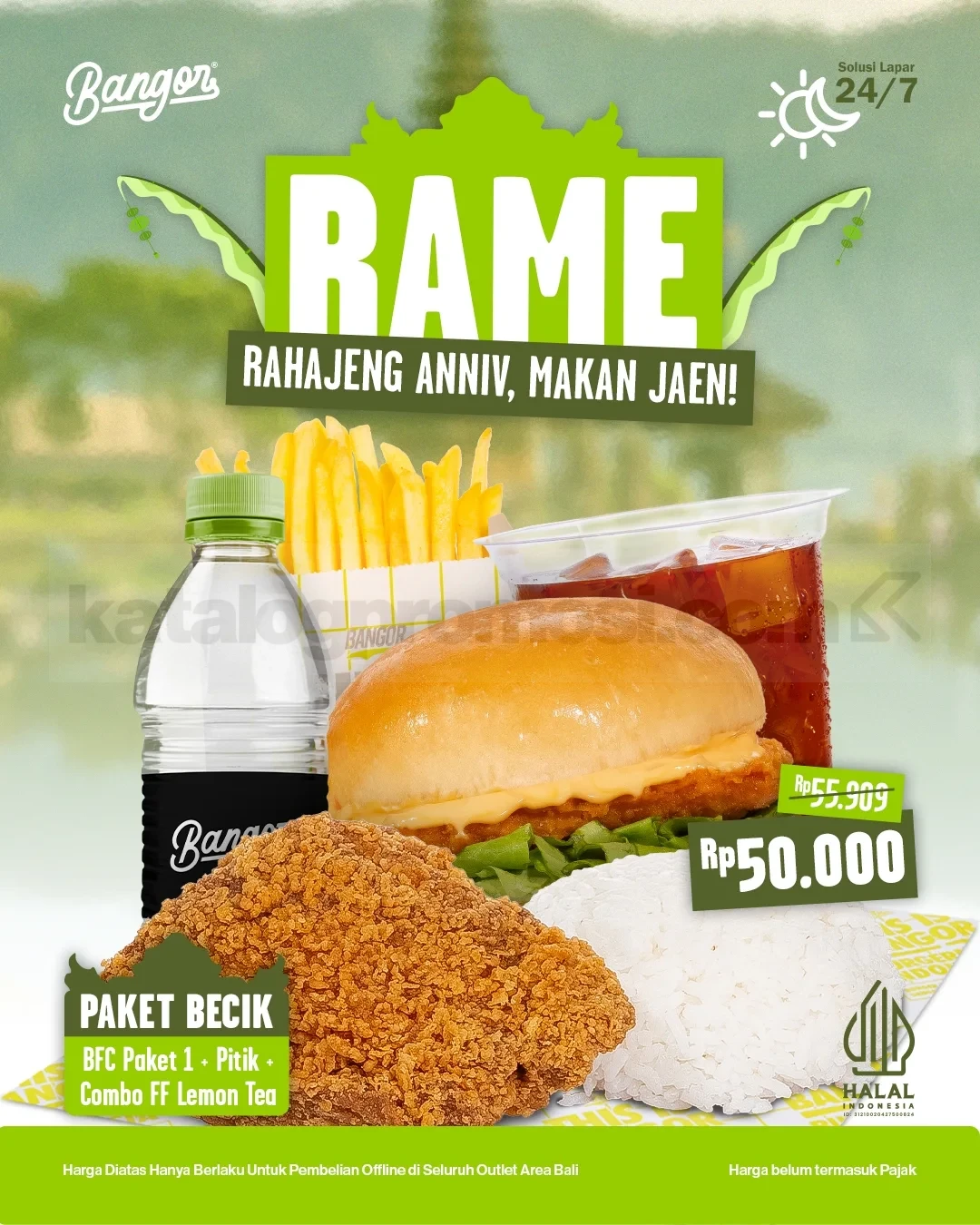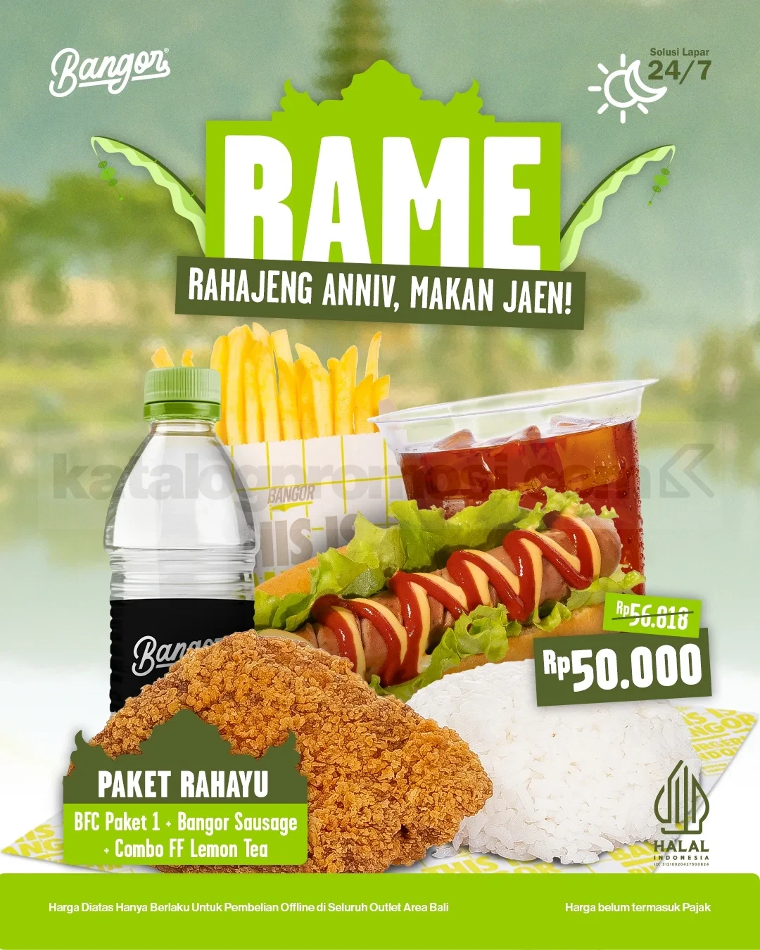 Promo Burger Bangor Anniversary Bali Paket Hemat Rp. 50.000 nikmati paket lengkap menu favorit dengan pembelian offline berlaku 20 April 2026 – 23 April 2026 di outlet Bali.