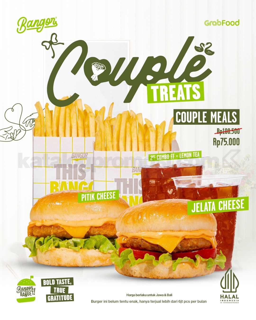 Promo Burger Bangor GrabFood Couple Treats Rp. 75.000 paket 2 burger, 2 kentang, 2 lemon tea berlaku mulai tanggal 12 Februari 2026 – 14 Februari 2026 di GrabFood.