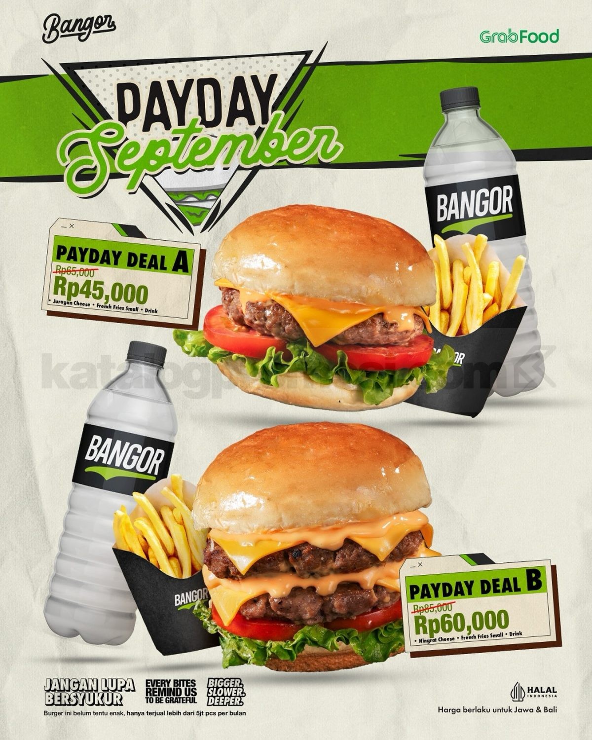 Mulai tanggal 25 September, Sobat Bangor bisa langsung nikmatin Promo Burger Bangor GrabFood Payday Harga Spesial mulai dari Rp45ribu! Ada dua pilihan paket kece buat nemenin momen gajian kamu: