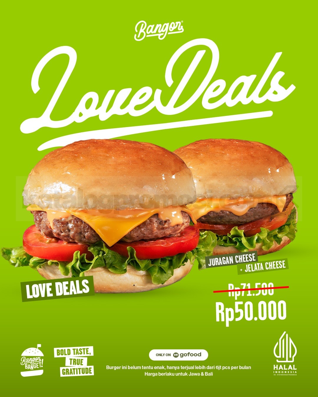 Promo Burger Bangor Love Deals Makan Berdua Rp. 50.000 dengan menu Juragan Cheese dan Jelata Cheese via GoFood, berlaku mulai tanggal 9-17 Februari 2026.