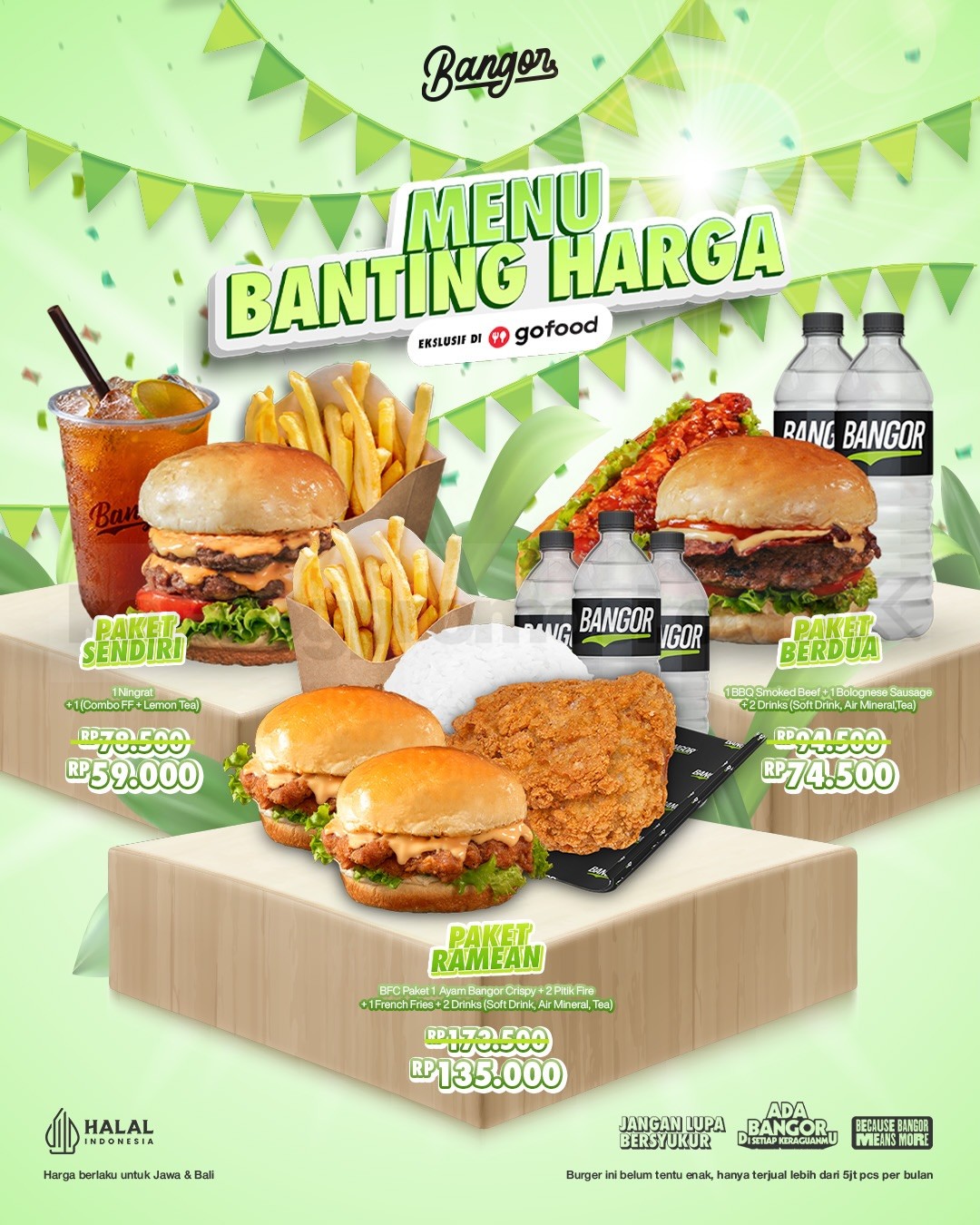 Promo Burger Bangor Menu Banting Harga mulai Rp. 59.000 dengan pilihan paket GoFood untuk makan sendiri, berdua, hingga ramean, berlaku mulai tanggal 5-15 Februari 2026 di Jawa dan Bali.