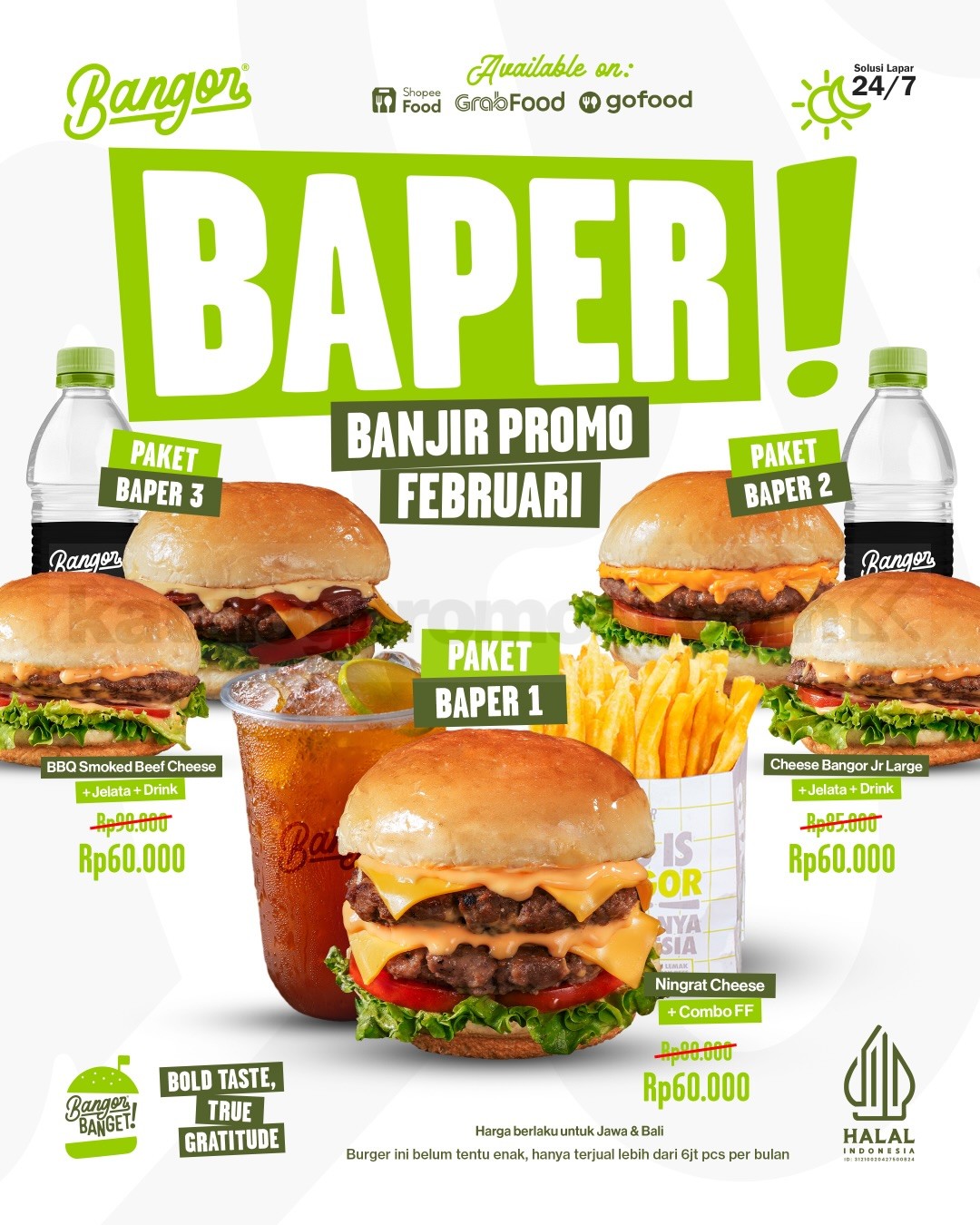 Promo Burger Bangor Paket BAPER Rp. 60.000 dengan pilihan paket burger lengkap untuk pemesanan online, berlaku mulai tanggal 5-28 Februari 2026.
