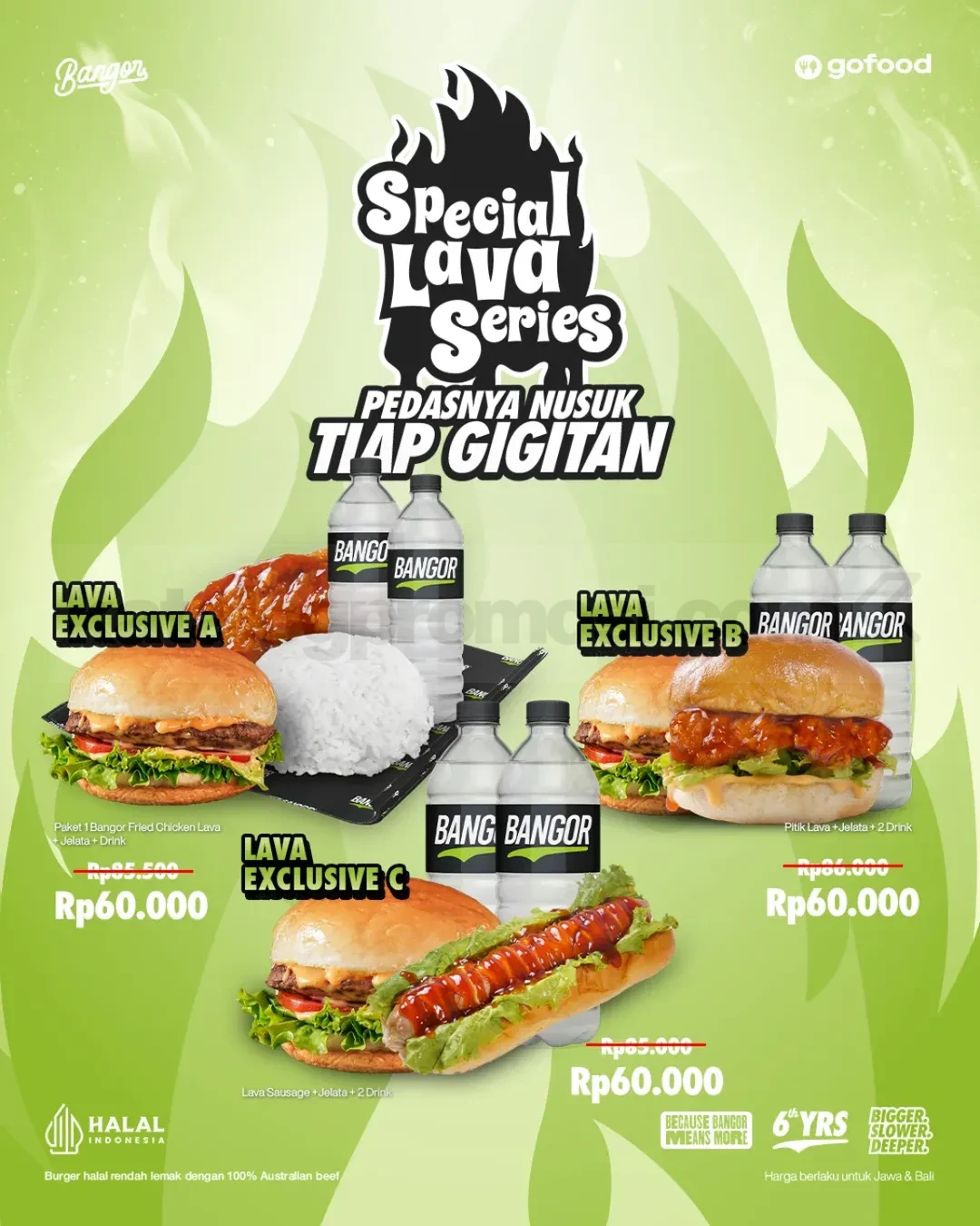 Gas sekarang juga dan jangan sampai kelewatan Promo Burger Bangor Paket Special Lava Series ini. Pilih menu lava favoritmu dan rasain pedasnya yang gokil, langsung pesan sekarang di outlet Burger Bangor terdekat ya!