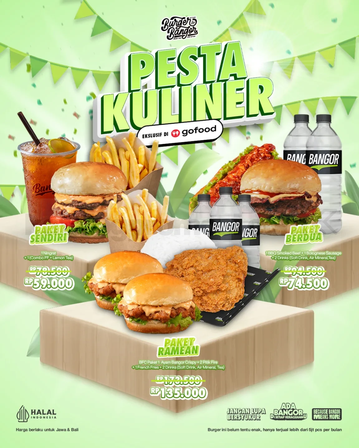 Promo Pesta Kuliner GoFood hadir! Dapatkan Burger Bangor paket lengkap mulai 59 ribuan. Cuma di GoFood, mulai tanggal 14 Mei–2 Juli 2025.
