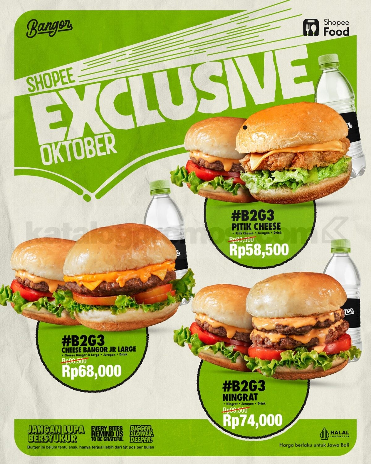 Promo Burger Bangor ShopeeFood Exclusive Oktober Buy 2 Get 3 Berlaku mulai tanggal 13-31 Oktober 2025.