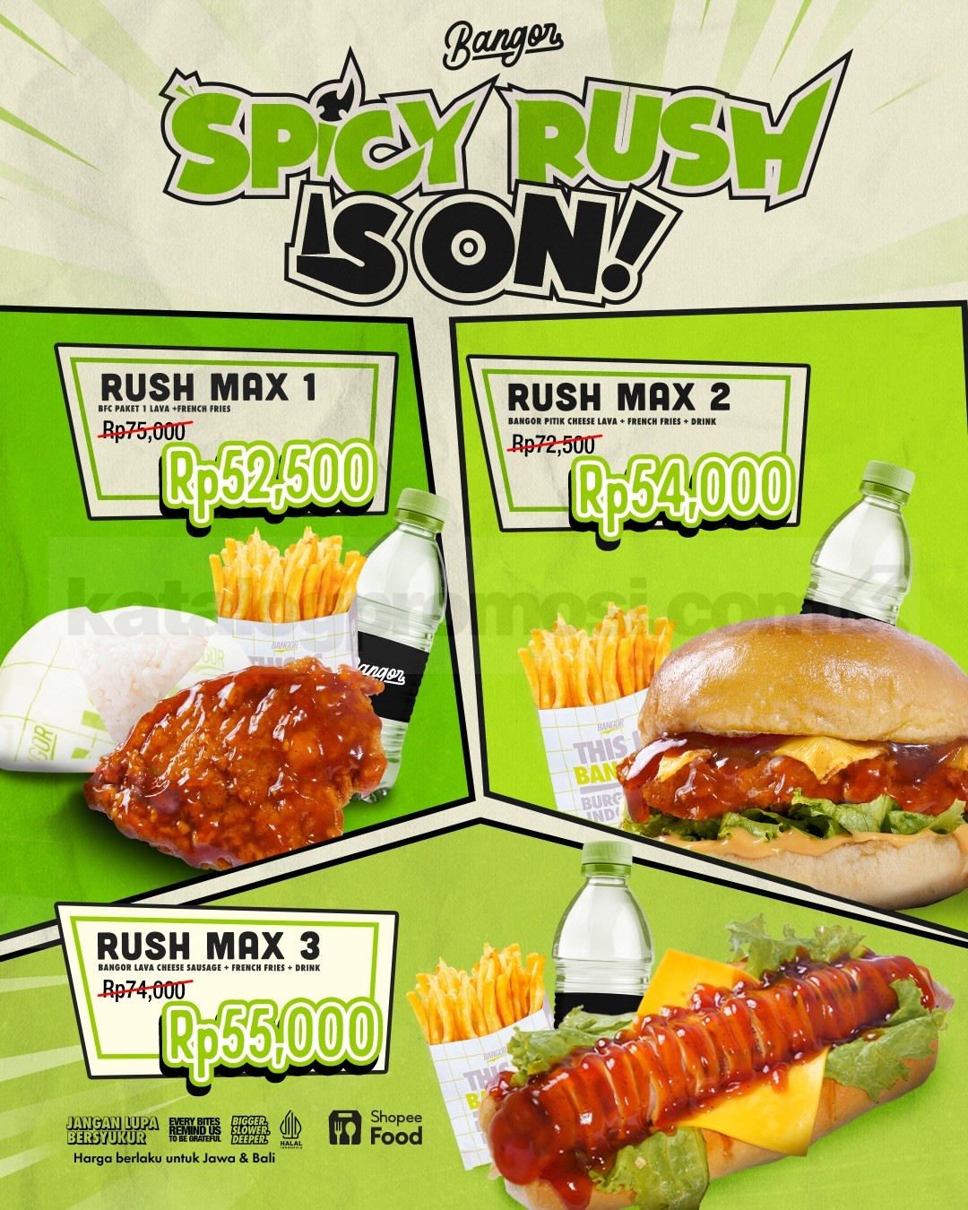 • RUSH MAX 3 berisi Bangor Lava Cheese Sausage, french fries, dan minuman dengan harga Rp55.000