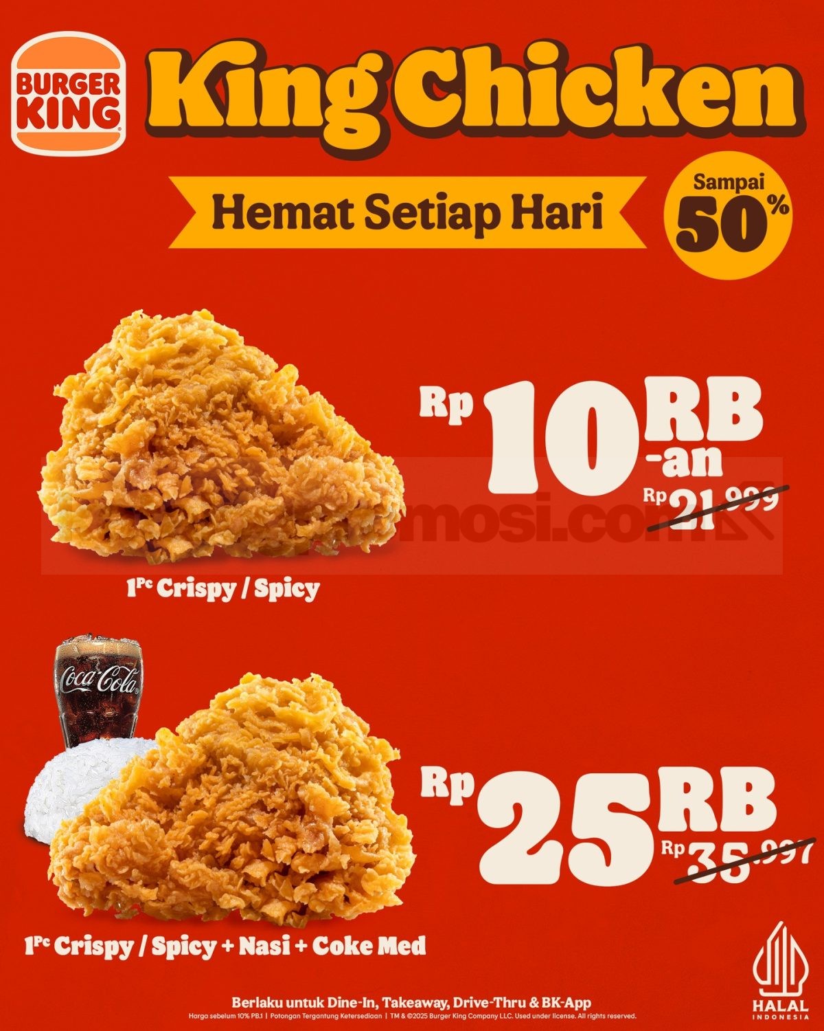 Promo Burger King Ayam Crispy hemat sampai 50% mulai Rp. 10.000 dan paket lengkap Rp. 25.000 dengan nasi dan Coke, berlaku periode terbatas di outlet tertentu.