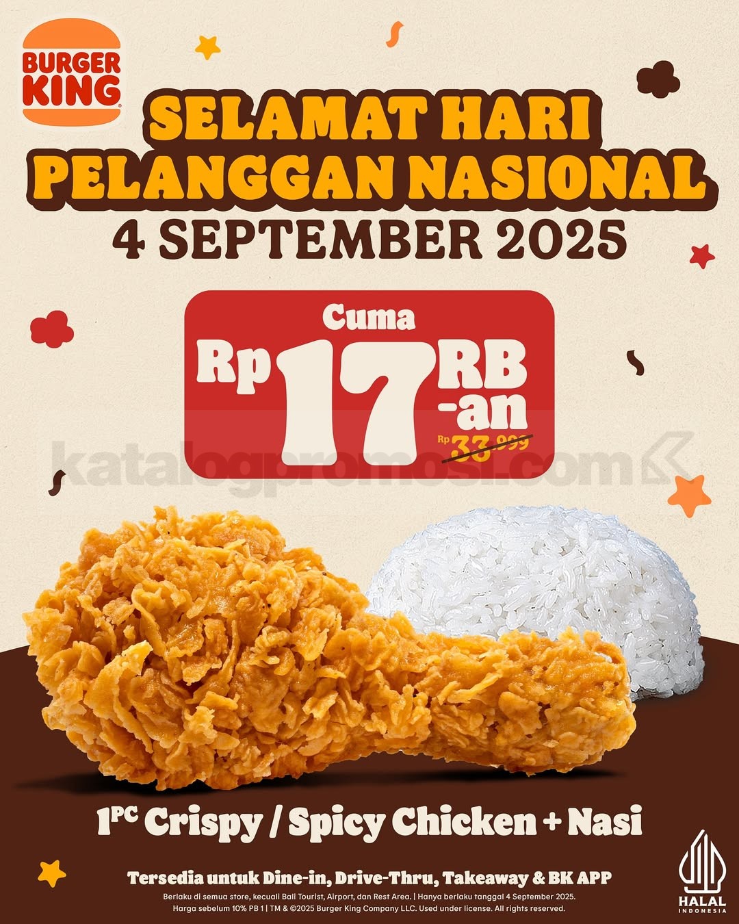 Promo Burger King Hari Pelanggan Nasional hadir di tanggal 4 September 2025. Nikmati paket ayam crispy/spicy + nasi cuma Rp17 ribuan.