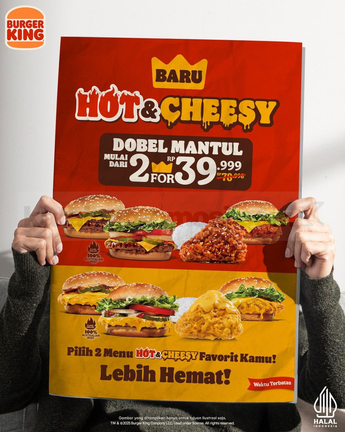 Promo Burger King Hot & Cheesy Dobel Mantul 2 for Rp39.999! Pilih 2 menu pedas keju favoritmu mulai Rp39.999 aja. Buruan ke BK sekarang sebelum kehabisan!