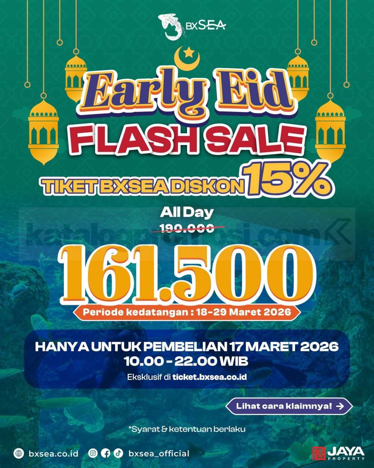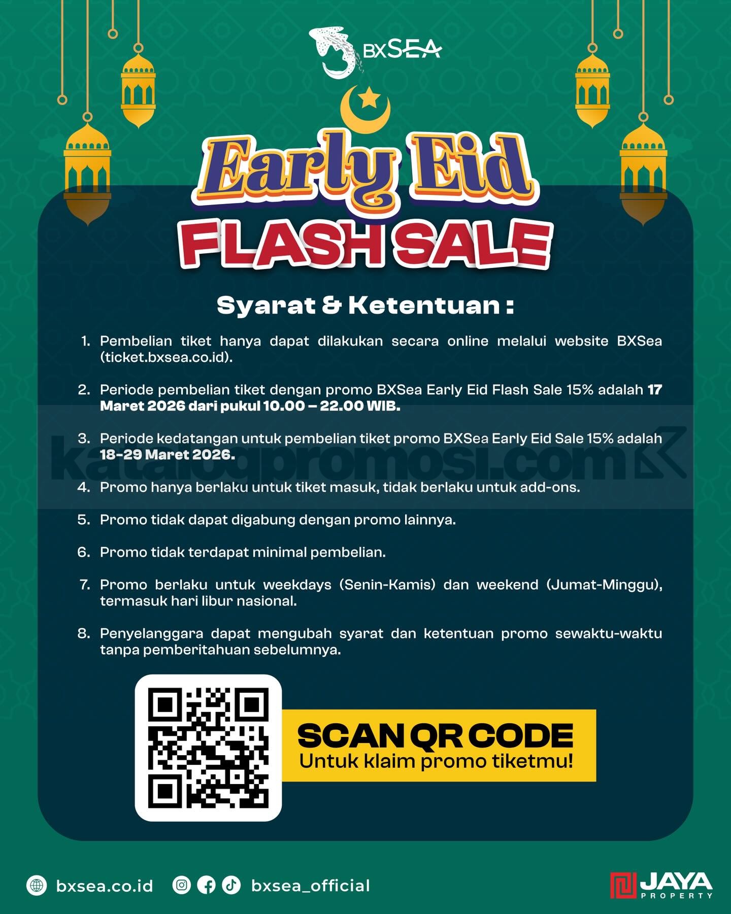 Promo BXSea Early Eid Flash Sale Tiket All Day Diskon 15% harga Rp. 161.500 untuk pembelian online berlaku mulai tanggal 17 Maret 2026 – 29 Maret 2026.