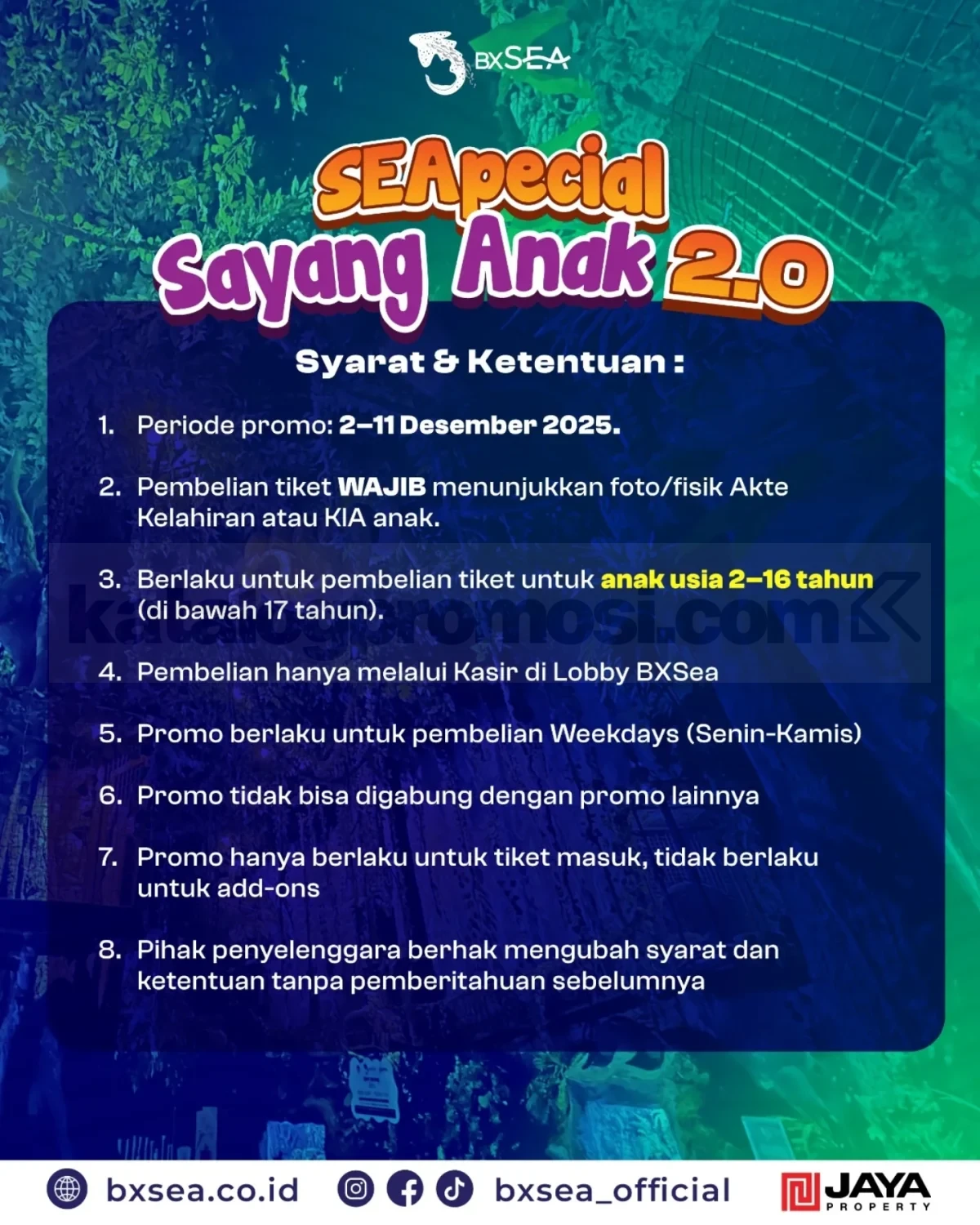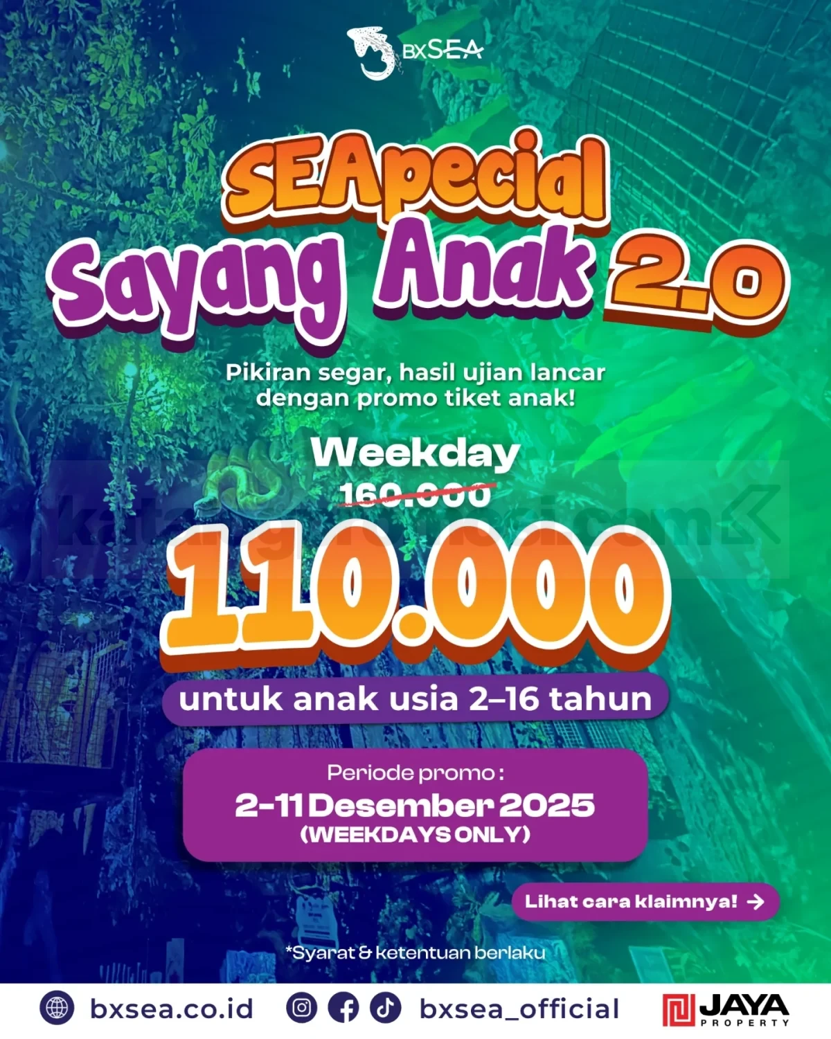 Promo BXSea SEApecial Sayang Anak tiket Rp.110.000 untuk wisata edukasi anak dengan pengenalan satwa dan pembelian langsung di kasir berlaku mulai tanggal 2β11 Desember 2025 di BXSea.