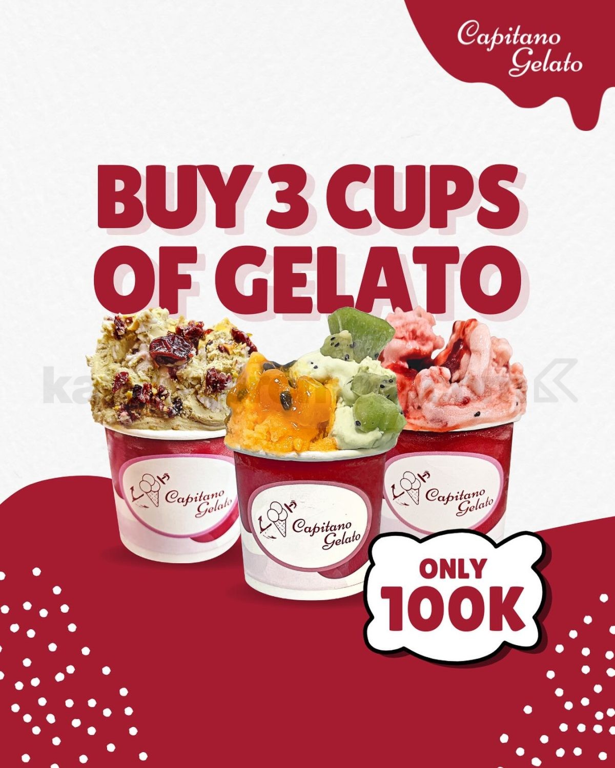 Lagi pengen manis-manis tapi dompet lagi low? Tenang aja, ada Promo Capitano Gelato yang siap nyelametin kamu dari panas dan bad mood π₯Άβ¨. Cuma di Capitano Gelato Living World Alam Sutera, kamu bisa dapetin 3 cup gelato favorit kamu cuma dengan 100 ribu doang! Yes, tiga sekaligus dan bebas mix rasa sesuka hatiβmau yang fruity, creamy, atau yang nyegerin banget, tinggal pilih!
