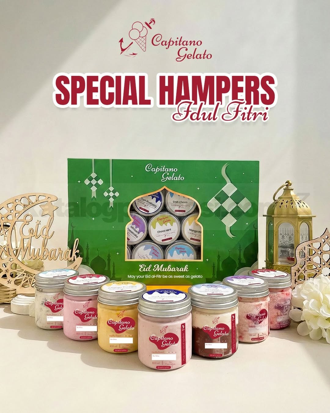 Promo Capitano Gelato Special Hampers Idul Fitri Rp. 275.000 paket 8 atau 12 jar gelato lengkap box dan kartu ucapan berlaku selama periode Ramadan hingga Idul Fitri