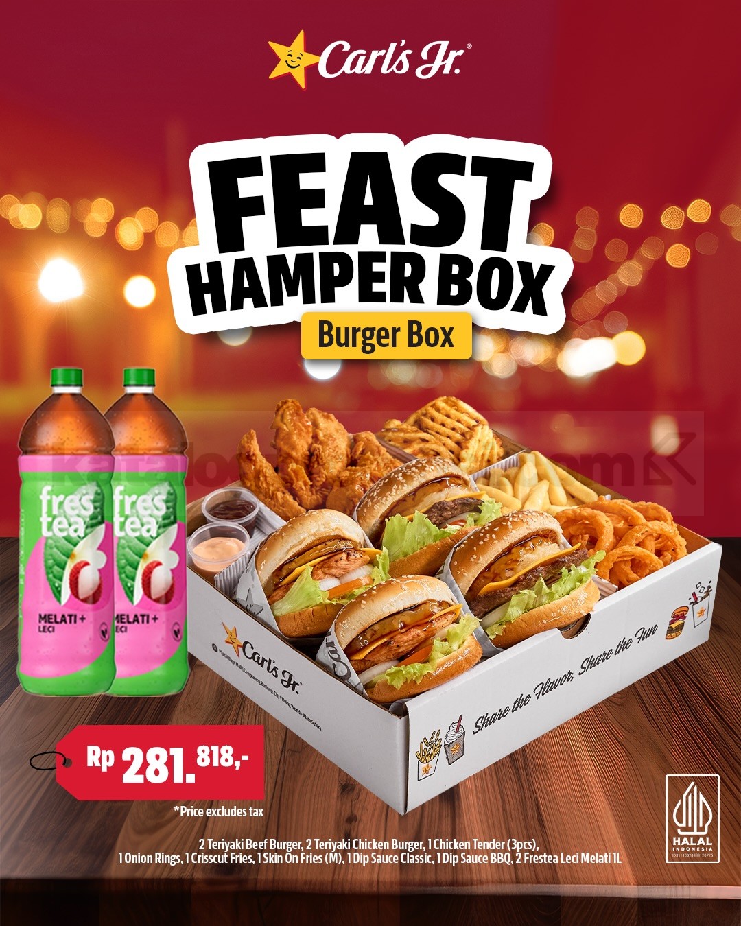 - FEAST HAMPER Burger Box seharga Rp. 281.818 (belum termasuk pajak) dengan isi 2 Teriyaki Beef Burger, 2 Teriyaki Chicken Burger, 1 Chicken Tender 3 pcs, 1 Onion Rings, 1 Crisscut Fries, 1 Skin On Fries ukuran M, 1 Dip Sauce Classic, 1 Dip Sauce BBQ, serta 2 Frestea Leci Melati 1 liter.