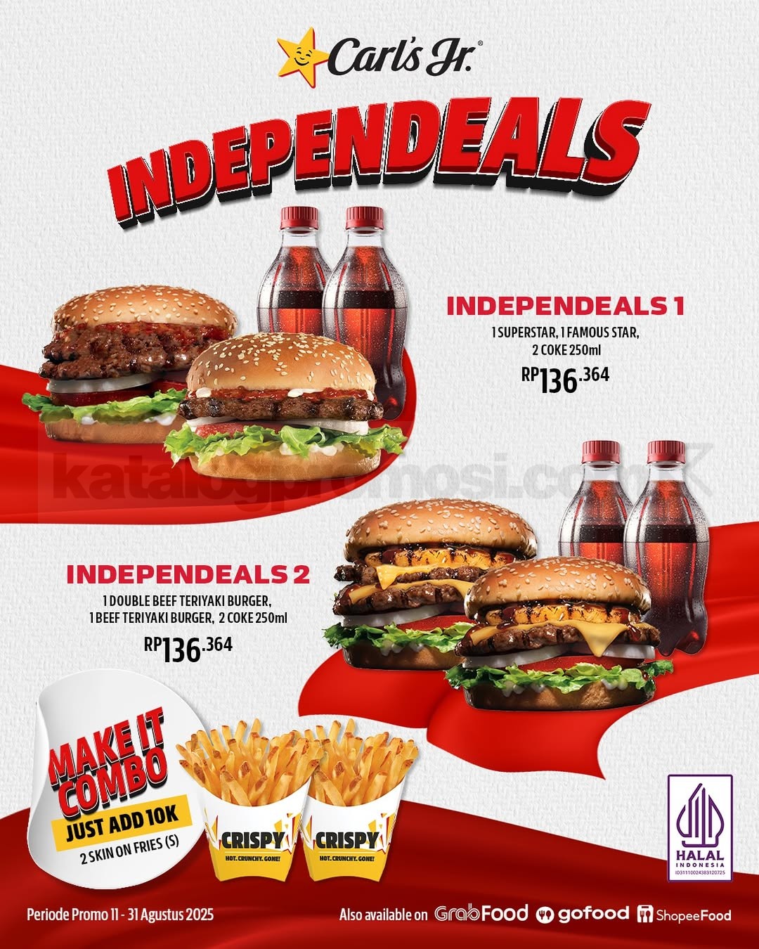 Spesial 17-an, Carl’s Jr. kasih paket hemat buat pecinta burger. Pilih antara Independeals 1 (1 Superstar + 1 Famous Star + 2 Coke 250ml) atau Independeals 2 (1 Double Beef Teriyaki Burger + 1 Beef Teriyaki Burger + 2 Coke 250ml). Semua cuma Rp136.364 aja, udah bisa makan ramean atau sharing bareng bestie.