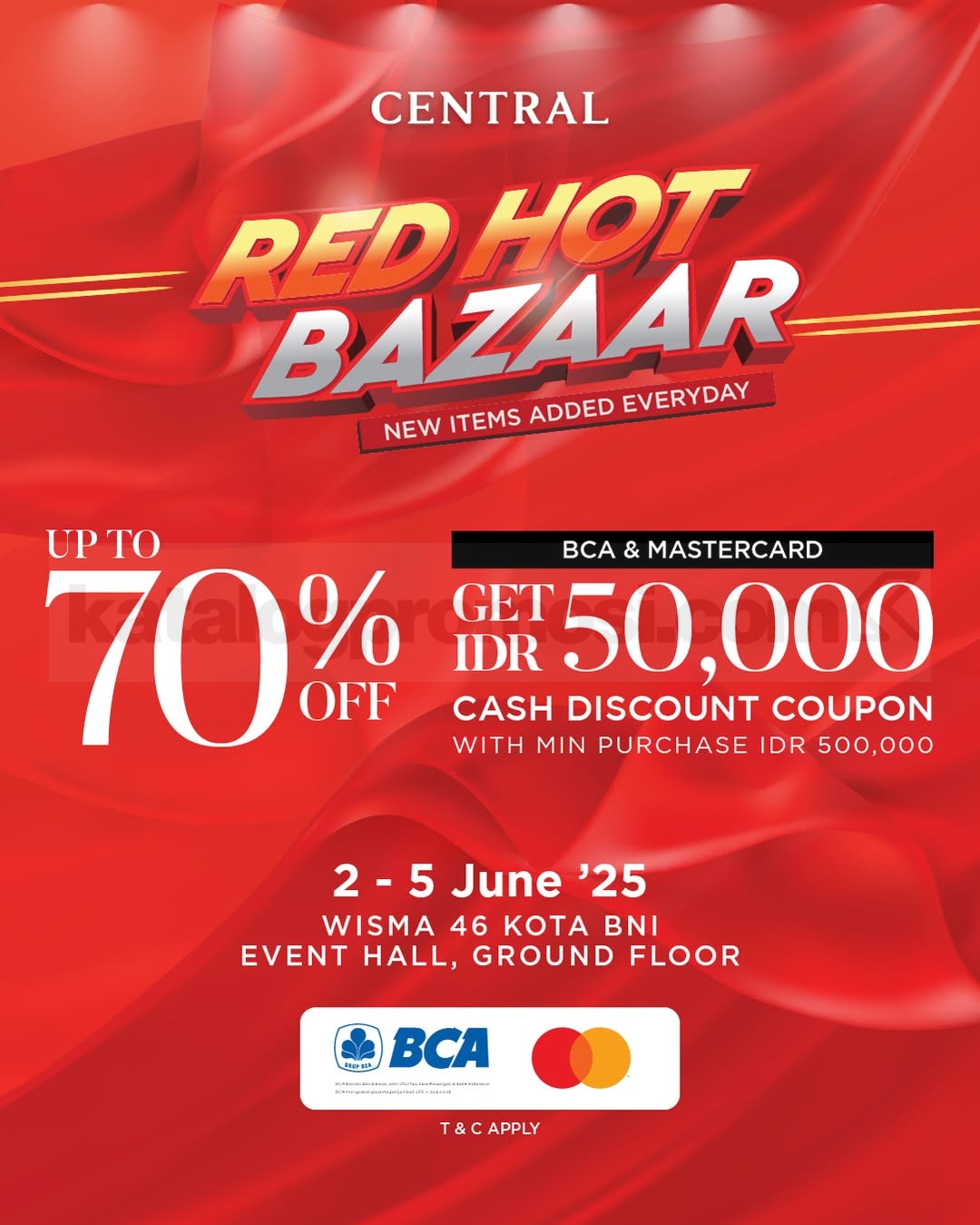 Promo Centra Red Hot Bazaar! Diskon hingga 70% dan cashback Rp50.000 pakai BCA/Mastercard. Hanya 2–5 Juni di Wisma 46!