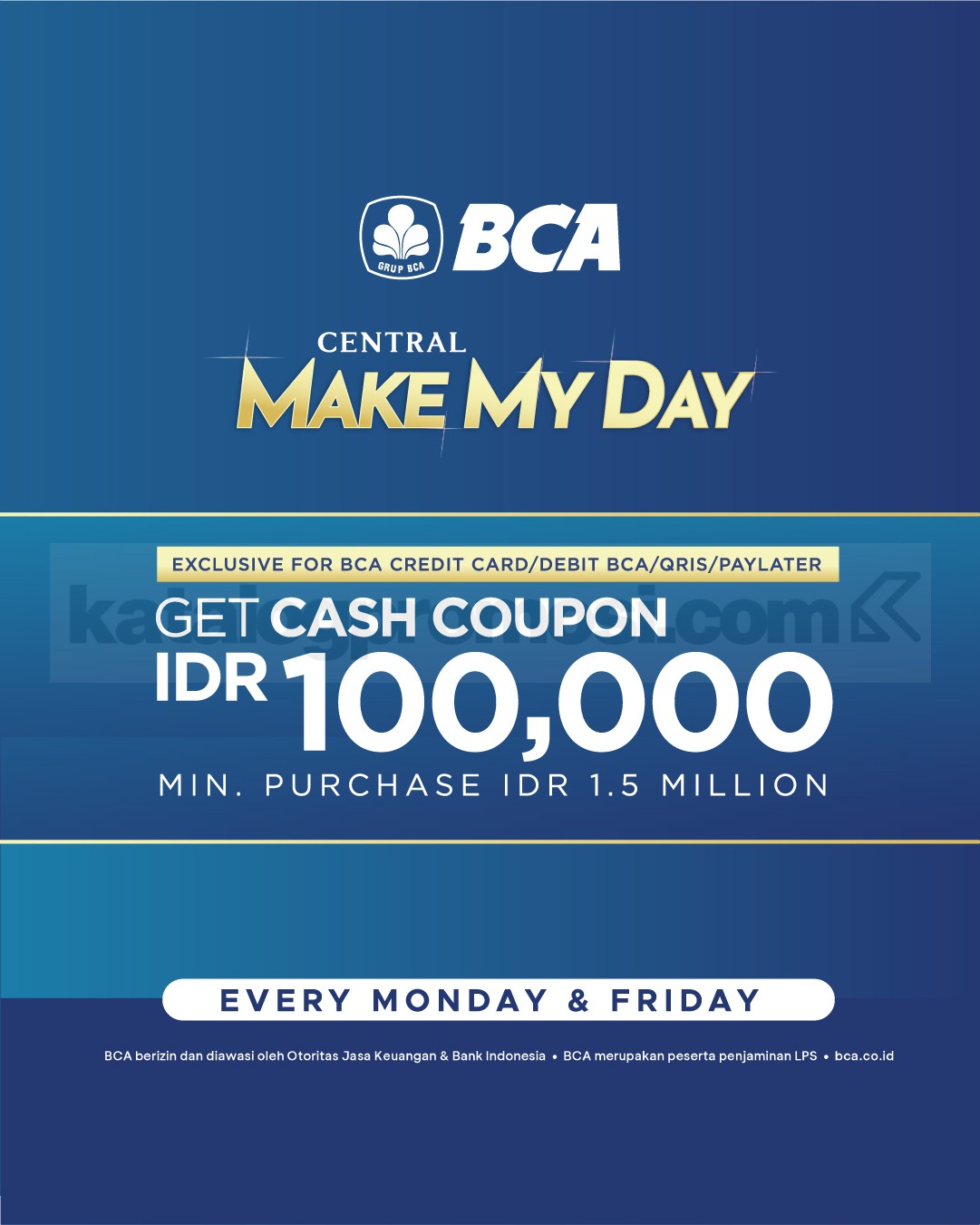 Melalui Promo Central BCA Cashback Kupon Rp. 100.000, transaksi minimal Rp. 1.500.000 akan mendapatkan satu cash coupon senilai Rp. 100.000. Kupon ini diberikan saat pembayaran menggunakan metode transaksi dari BCA.
