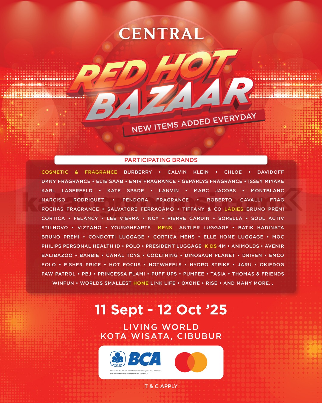 Promo Central Red Hot Bazaar diskon hingga 70% plus kupon Rp50.000 dengan BCA dan Mastercard, berlaku 11 September – 12 Oktober 2025 di Living World Kota Wisata.