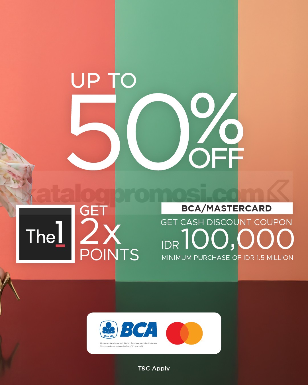 Program ini juga memberi tambahan 2X points untuk transaksi menggunakan The 1 Card selama periode Central Viva Shoes Handbags Diskon hingga 50%.